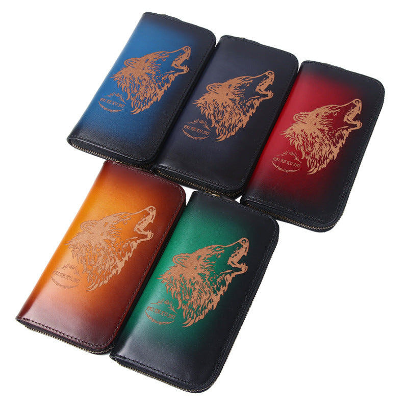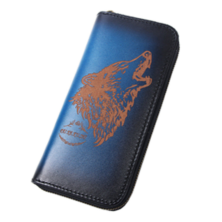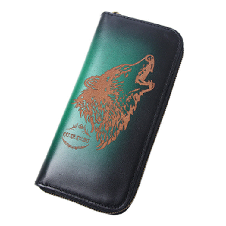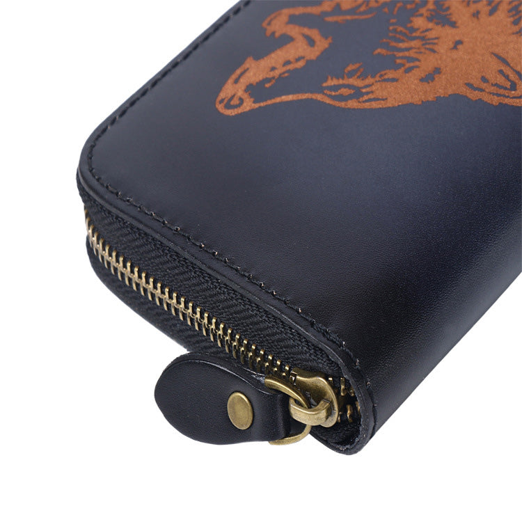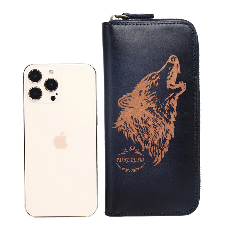 Around Zip Black Leather Long Wallet Mens Wolf Zipper Clutch Wallet for Men