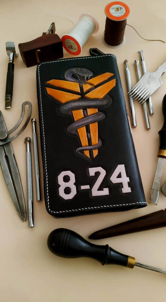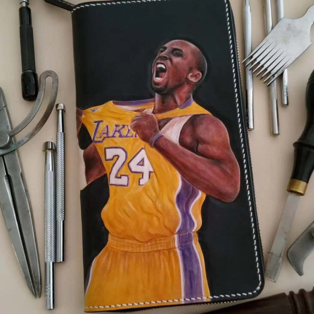 Design: Badass Black Leather Men's Kobe Bryant Yellow Jersey Long Biker Wallet Handmade Tooled Zipper Long Wallets For Men