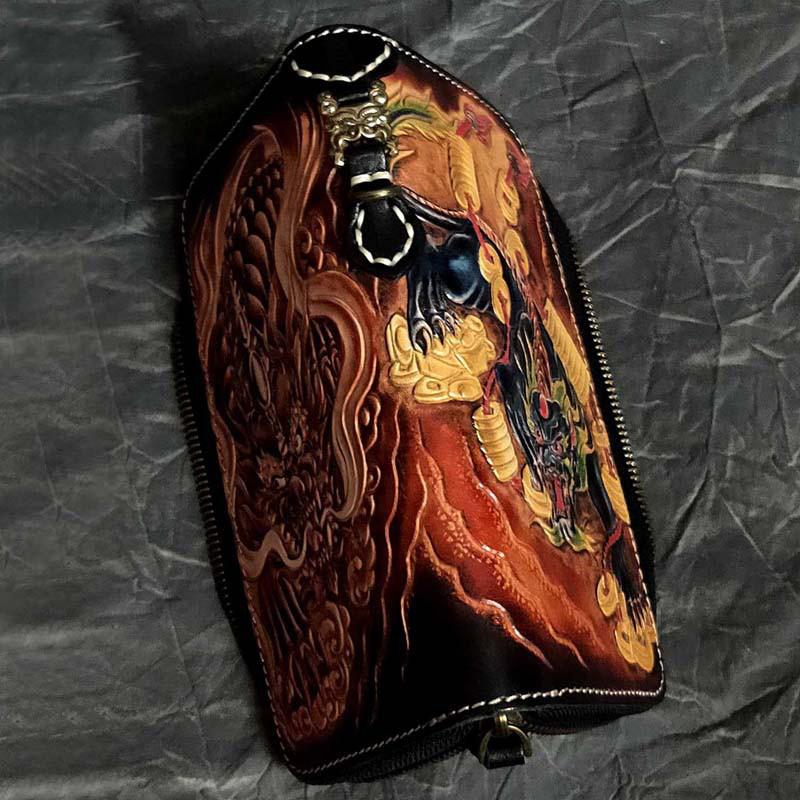 Design: Badass Black Leather Men's Long Biker Handmade Wallet Beast Totem Tooled Zipper Long Wallets For Men