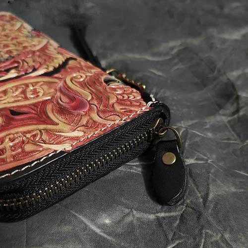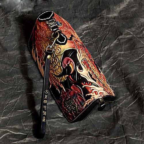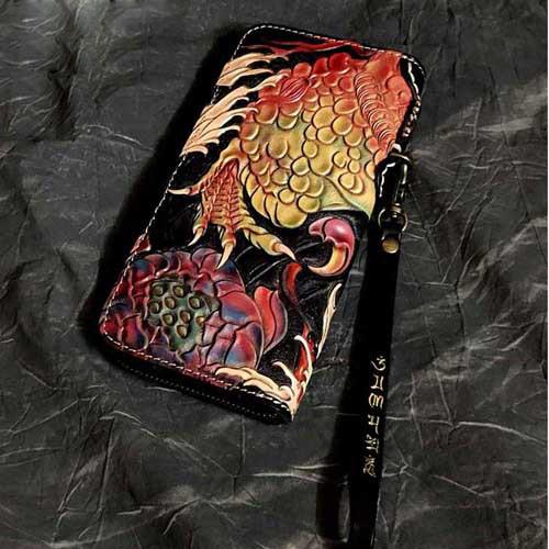Style: Badass Black Leather Men's Long Biker Handmade Wallet Golden Koi Tooled Zipper Long Wallets For Men