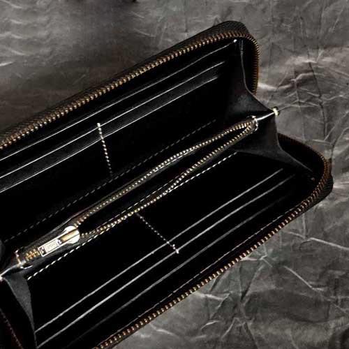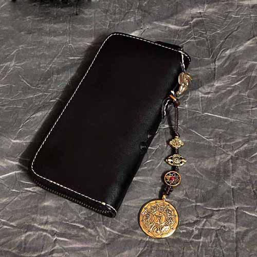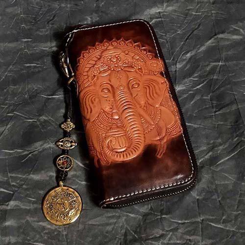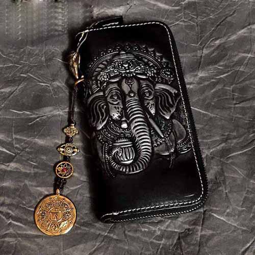Style: Badass Black Leather Men's Long Biker Handmade Wallet Ganesha Tooled Zipper Chain Long Wallets For Men