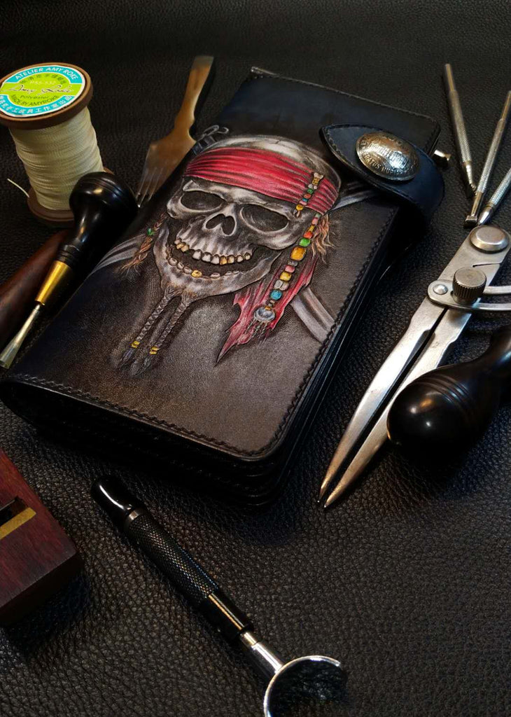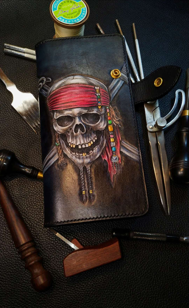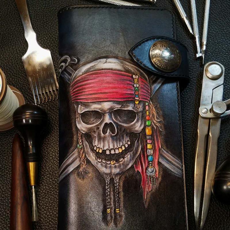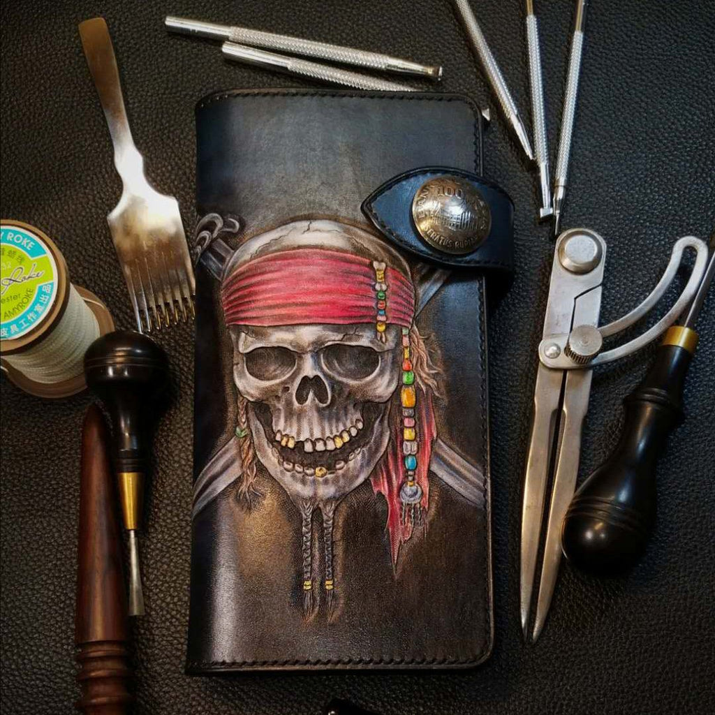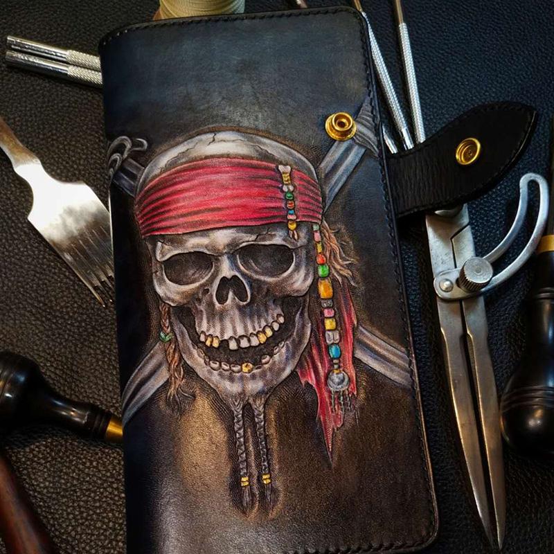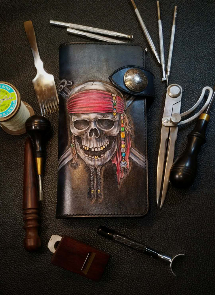Design: Badass Black Leather Men's Pirate Skull Long Biker Wallet Handmade Tooled Zipper Long Wallets For Men