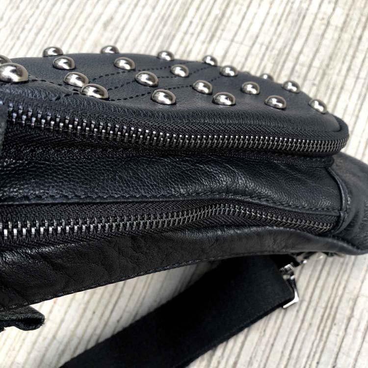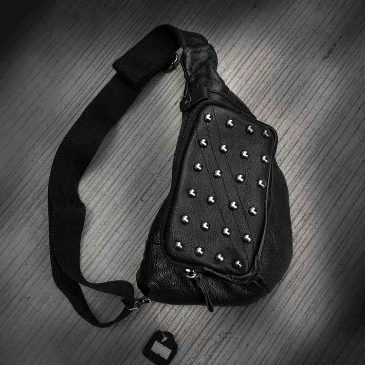 Badass Black Leather Men's Sling Bag Punk Chest Bag Rivet One shoulder Backpack Phone Bag For Men