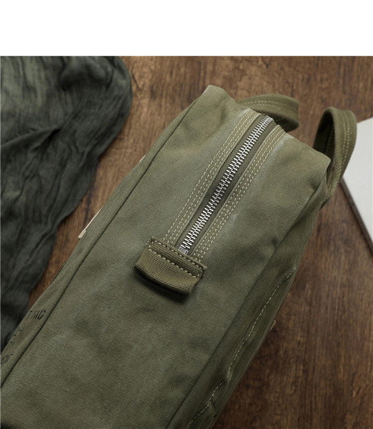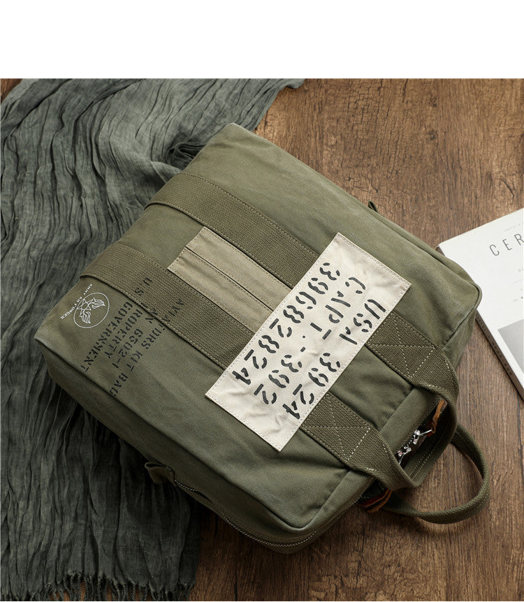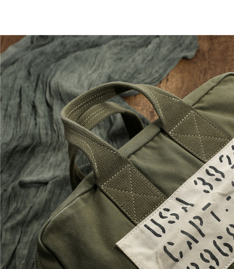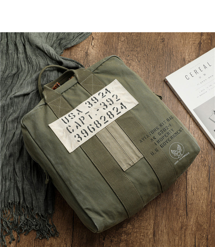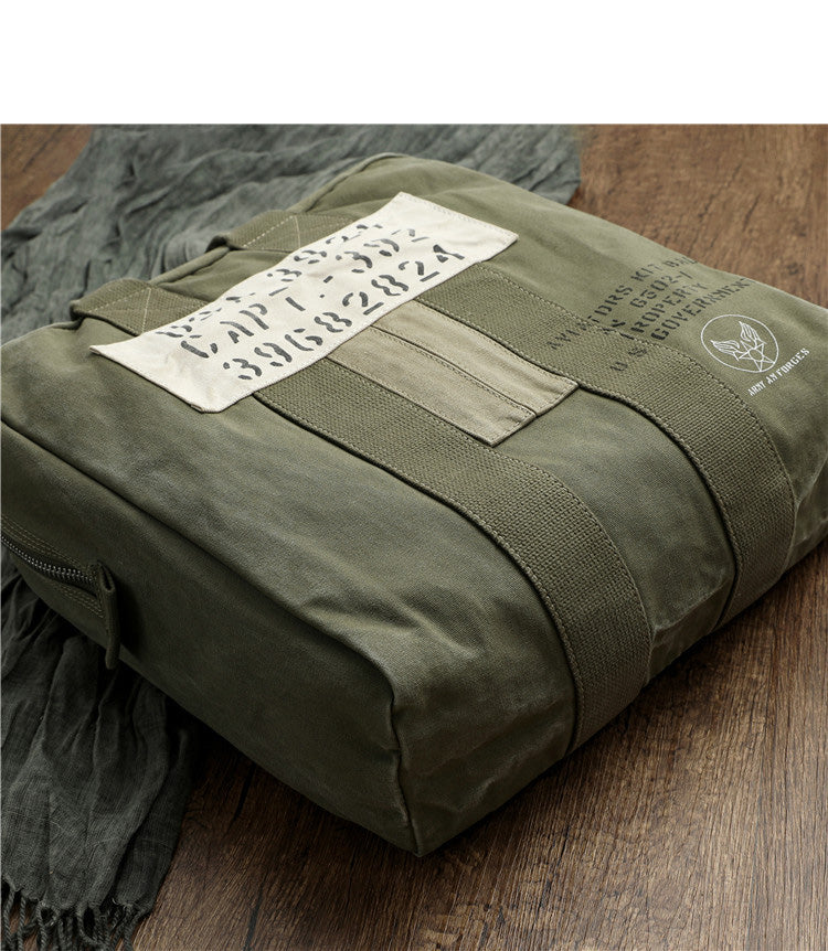 Crafted from durable, high-quality canvas, the bag draws inspiration from the rugged, utilitarian designs of World War II, ensuring both longevity and a timeless aesthetic. The army green color adds a touch of vintage military charm, making it a versatile piece that complements both casual and professional attire.