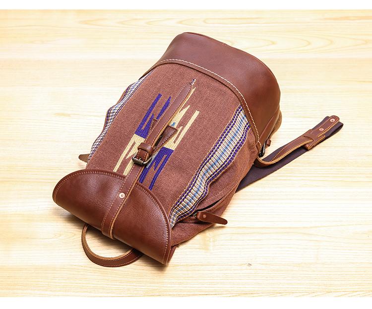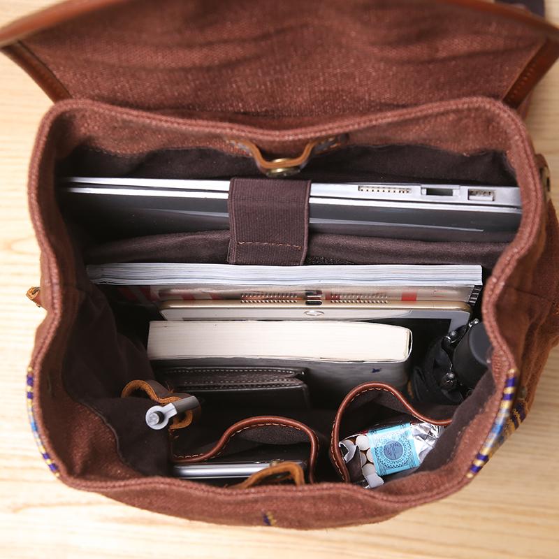 Style: Brown Emroidered Canvas Leather Mens Women Large 15'' College Backpack Travel Backpack for Men