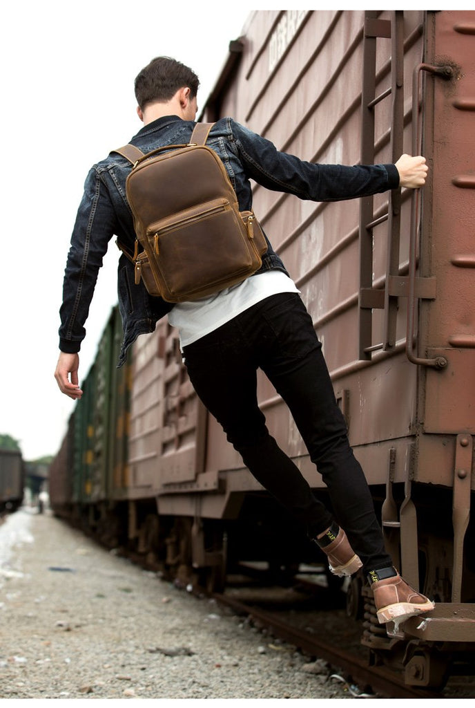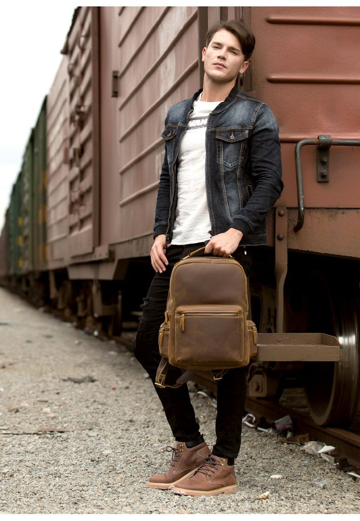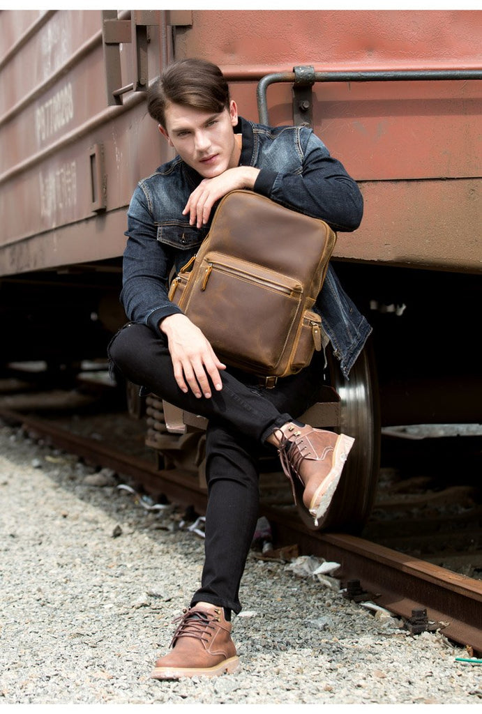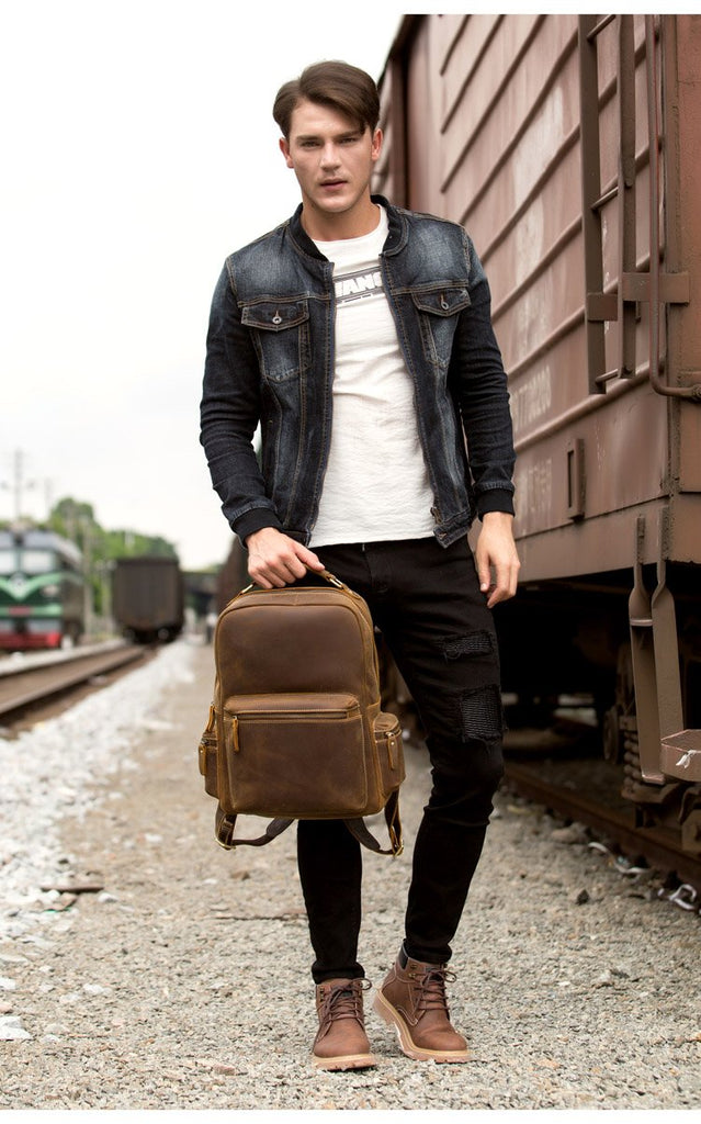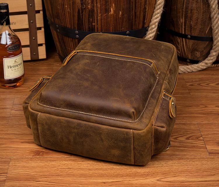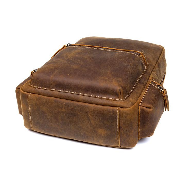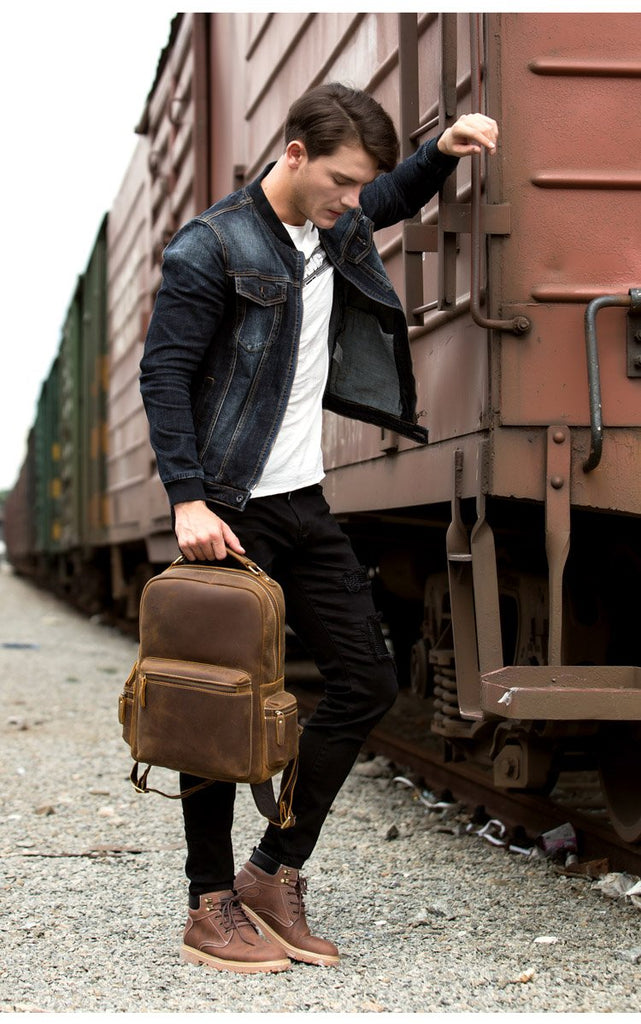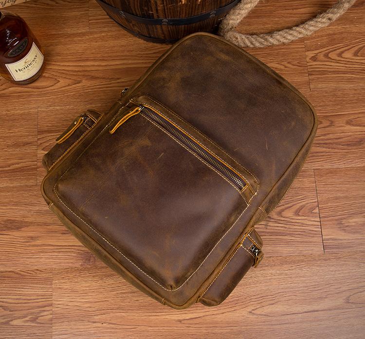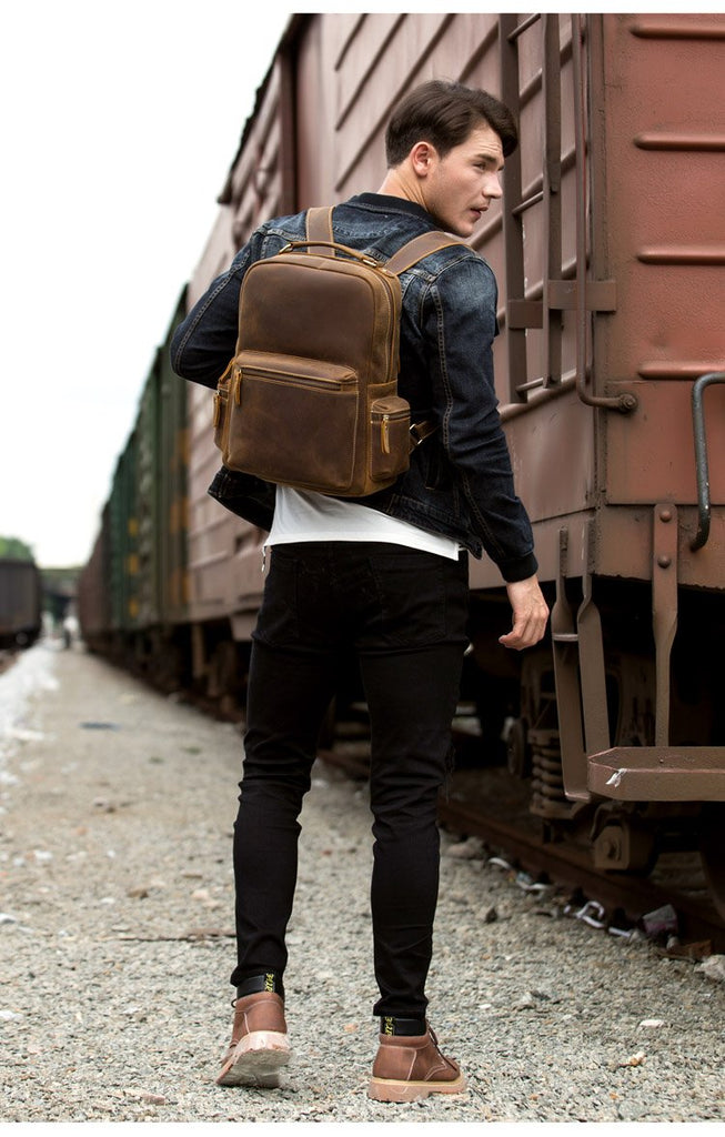 Design: Brown Fashion Mens Leather 15-inch Computer Backpack Dark Brown Travel Backpack School Backpacks for men