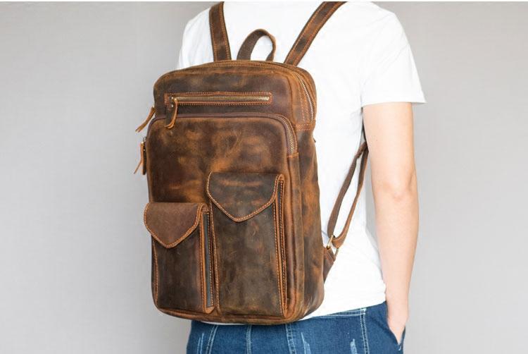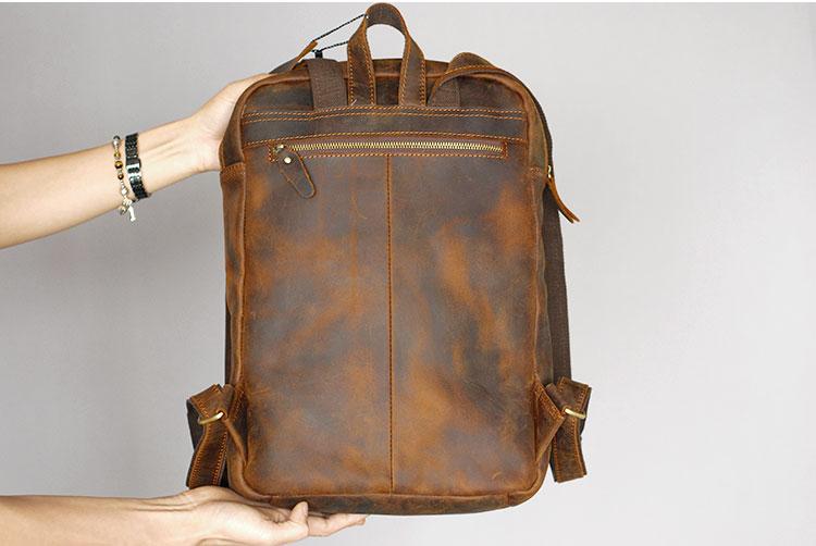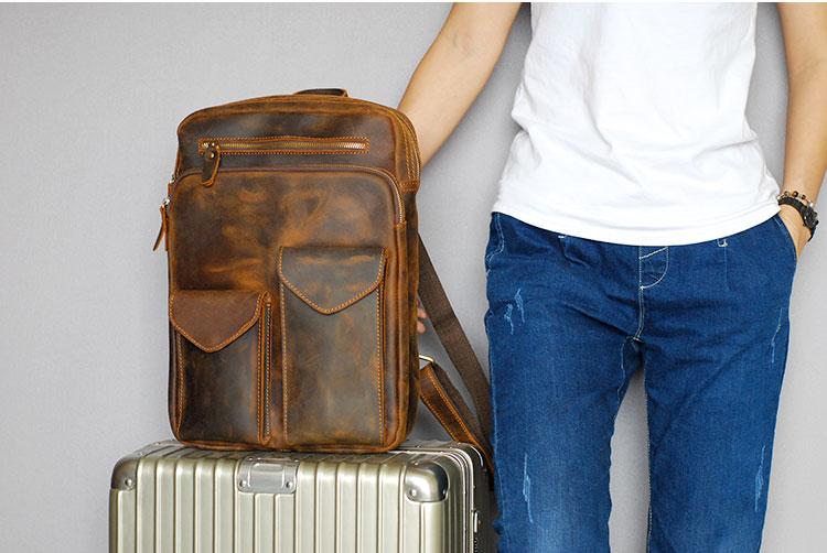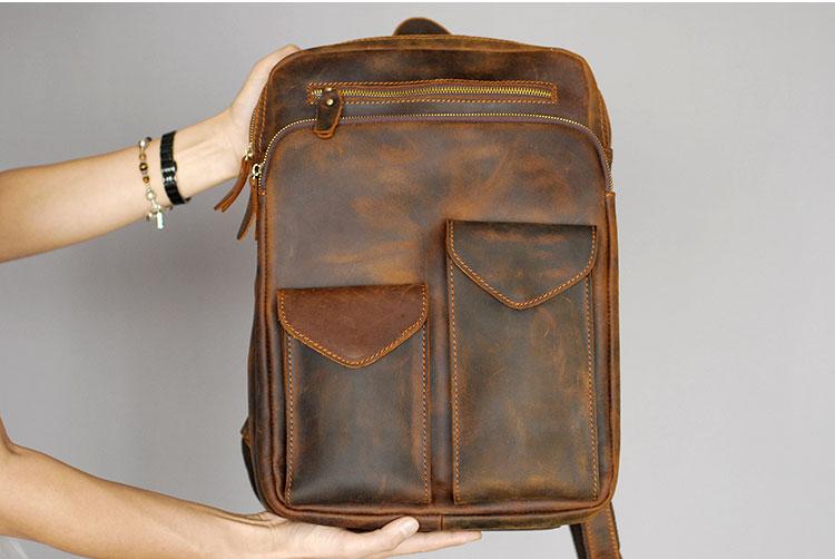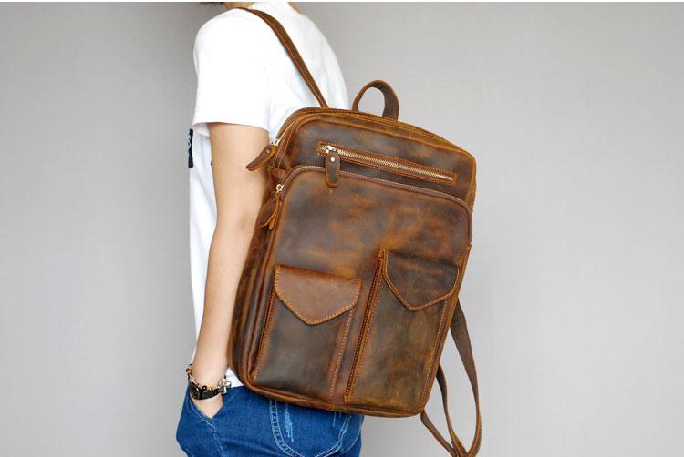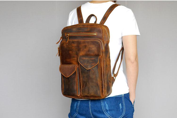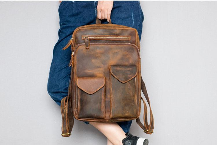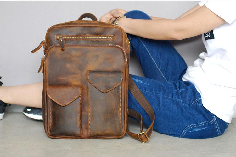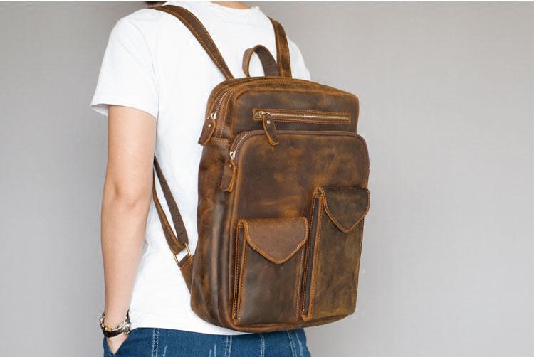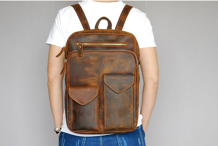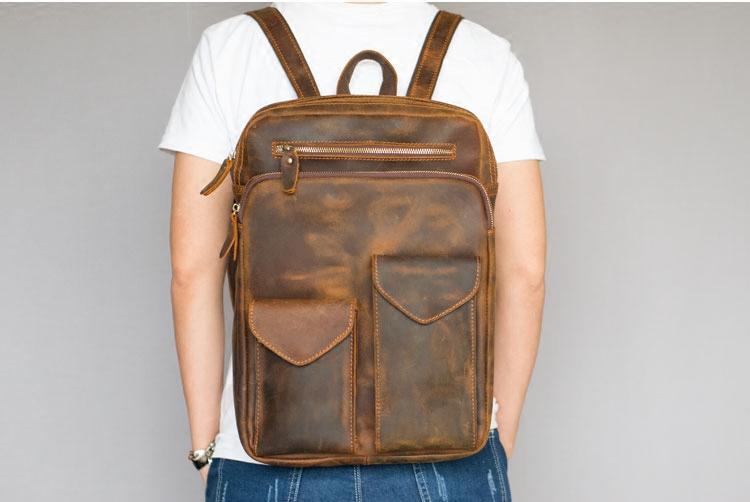 Design: Brown Leather Mens 14" Laptop Durable Backpack Hiking Backpack Travel Backpack College Bag for Men