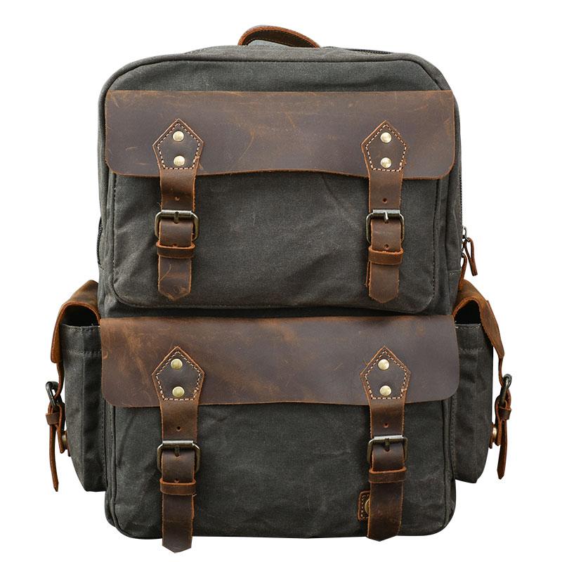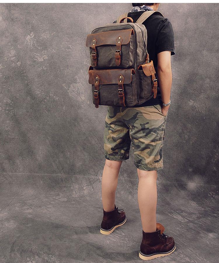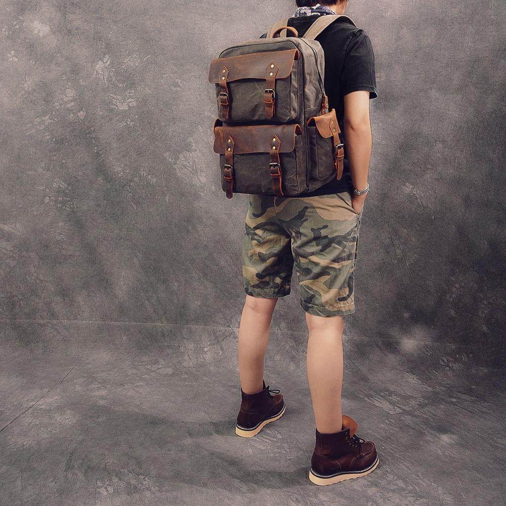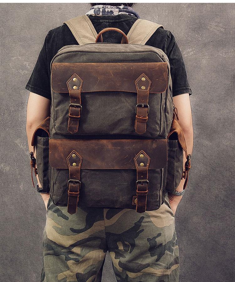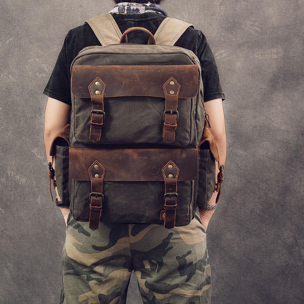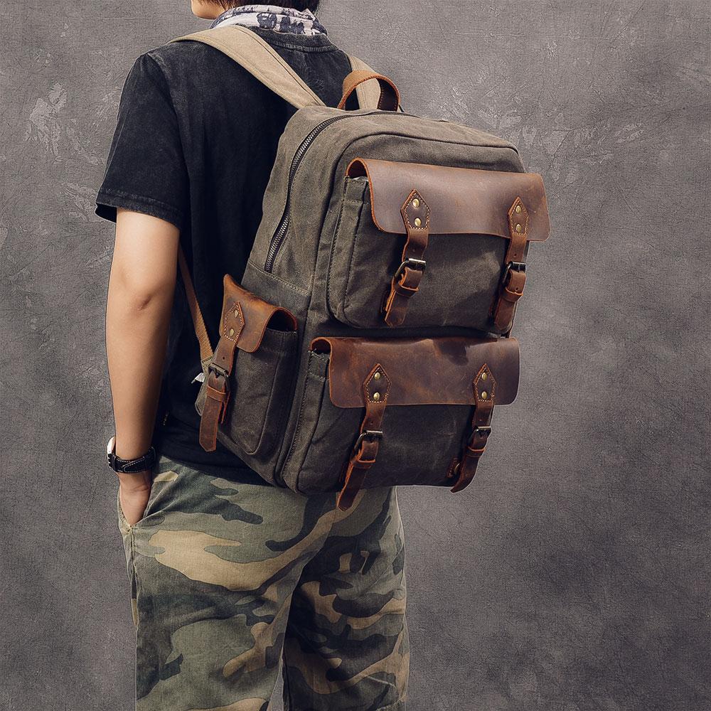 Design: Waxed Canvas Leather Mens 15" Laptop Backpack Army Green Travel Backpack Dark Gray College Backpack for Men