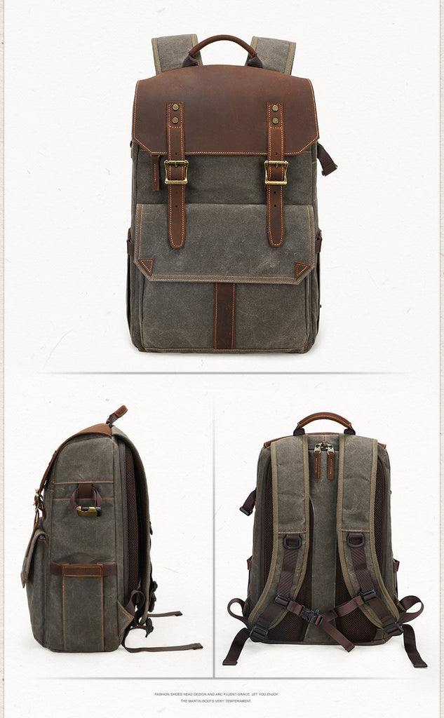 Design: Canvas Leather Mens 12" Camera Backpack Army Green Travel Backpack Khaki College Backpack for Men