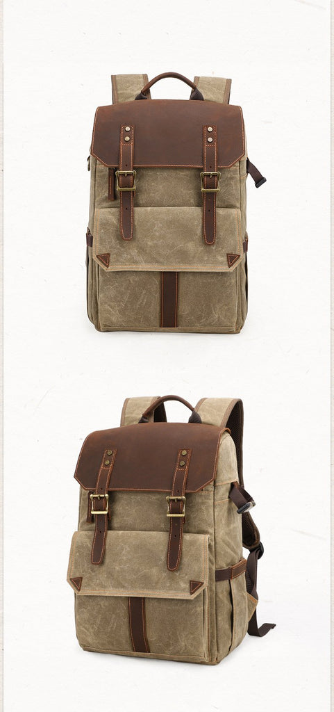 Style: Canvas Leather Mens 12" Camera Backpack Army Green Travel Backpack Khaki College Backpack for Men