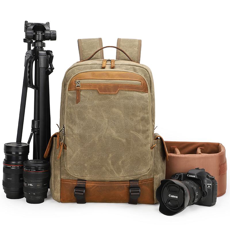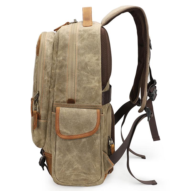 Design: Canvas Leather Mens 15" Camera Backpack Army Green Travel Backpack Khaki College Backpack for Men