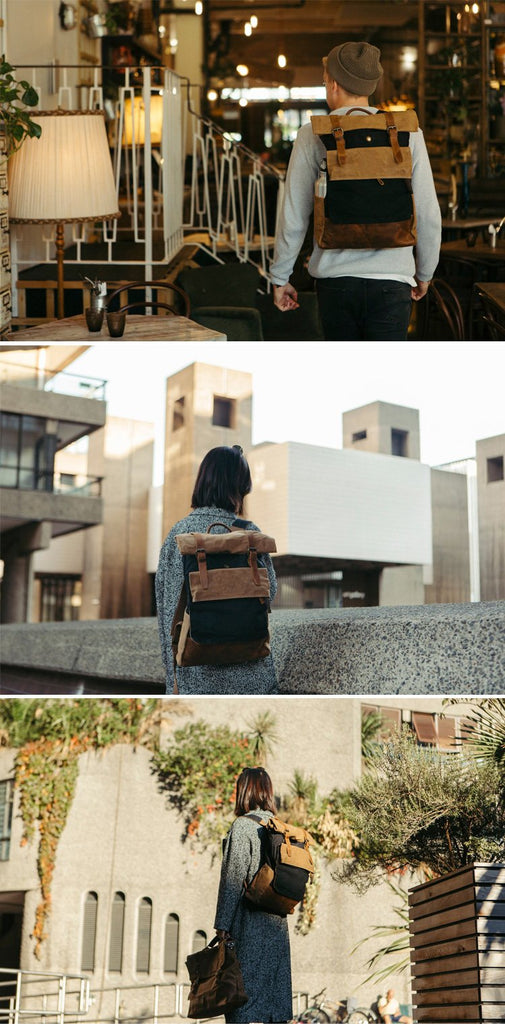 Design: Cool Waxed Canvas Leather Mens Black 15'' Large Waterproof Travel Backpacks Computer Hiking Backpack for Men