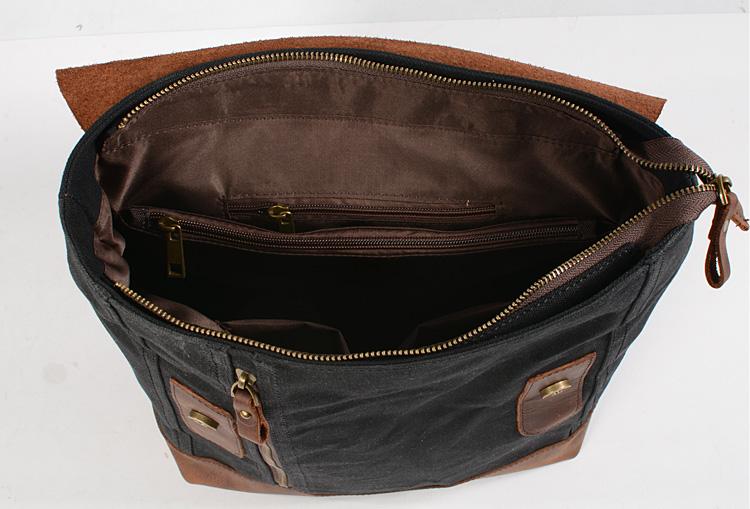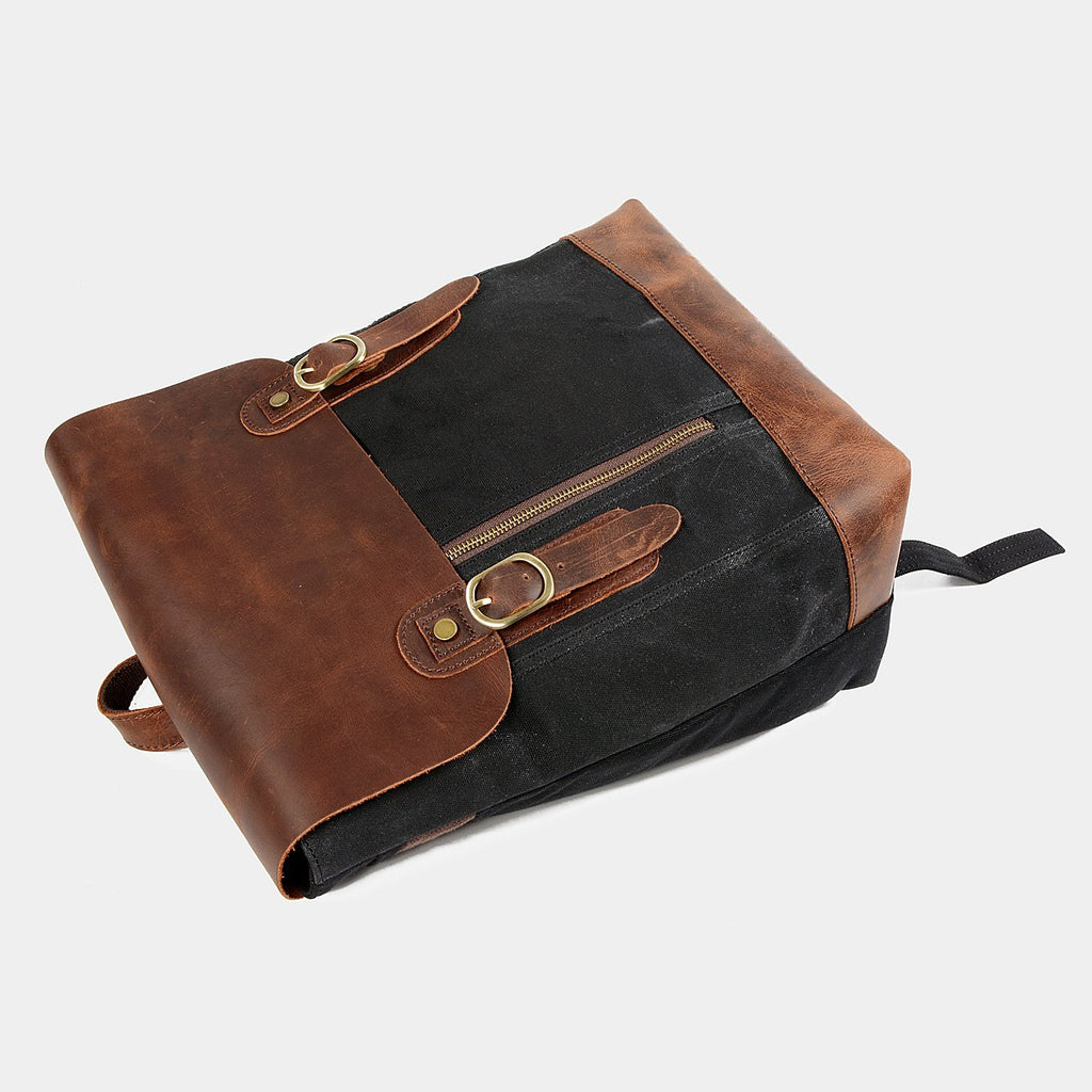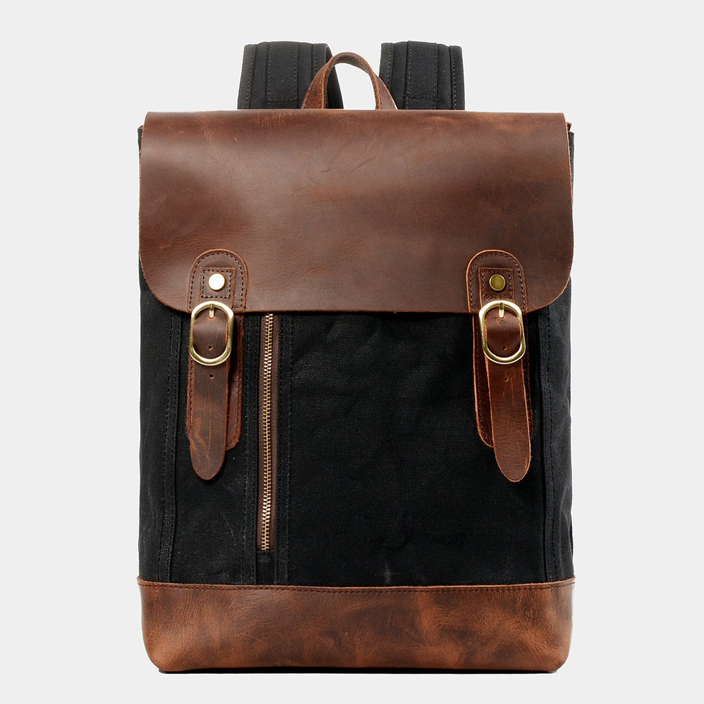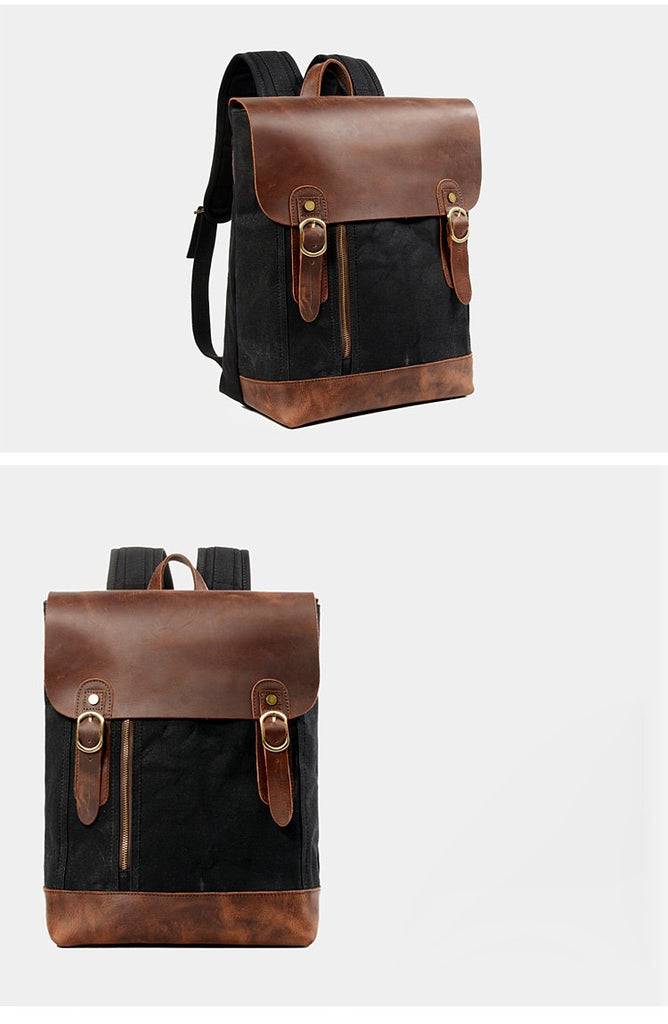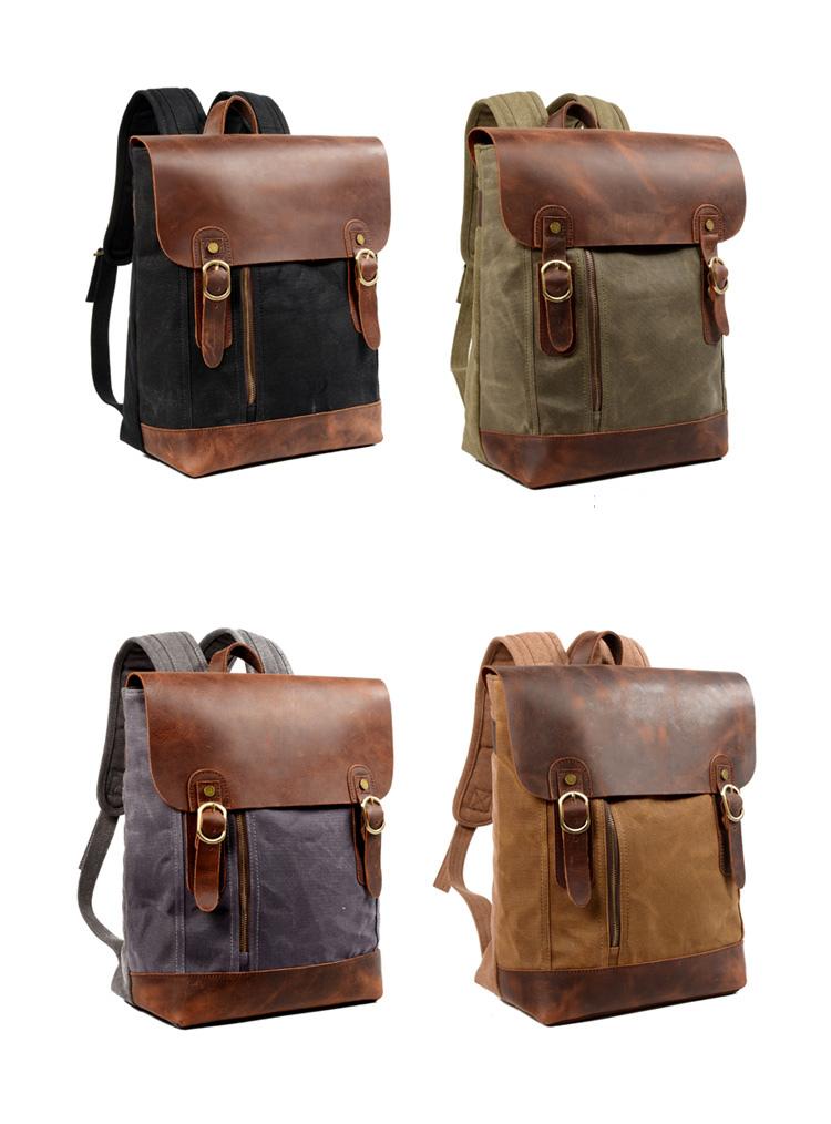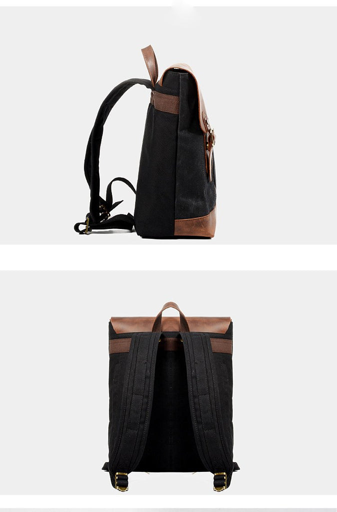 Design: Waxed Canvas Leather Mens 14'' Waterproof Black School Backpack Green Travel Backpack for Men
