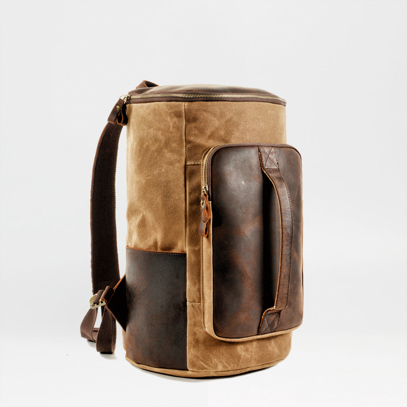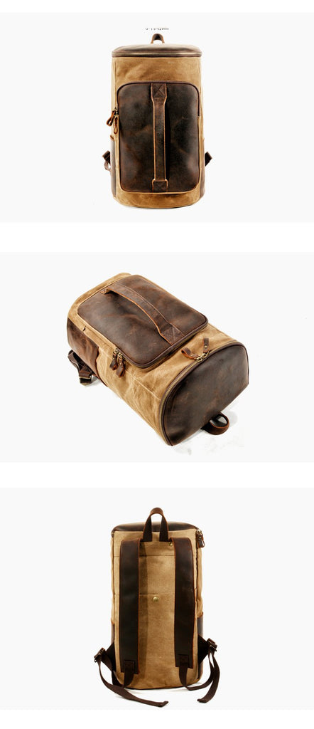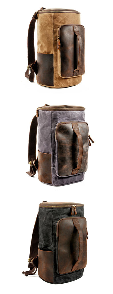 Design: Cool Waxed Canvas Black Leather Mens 15.6‘’ Barrel Green Backpack Travel Backpack Hiking Backpack for Men