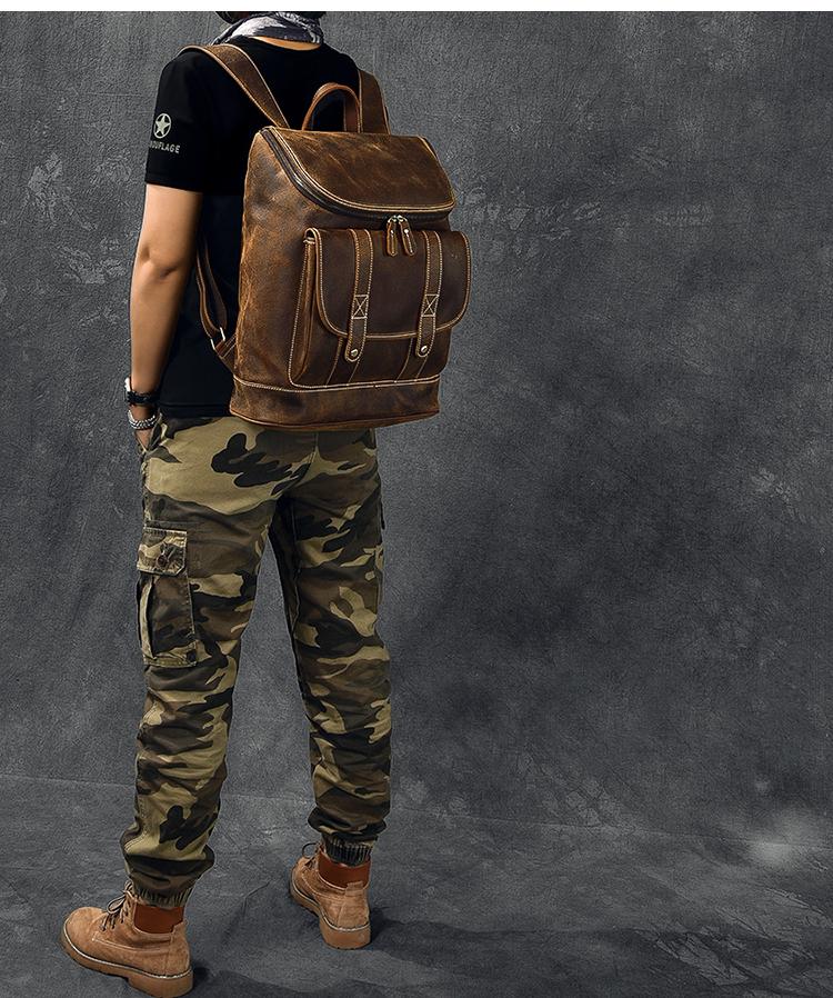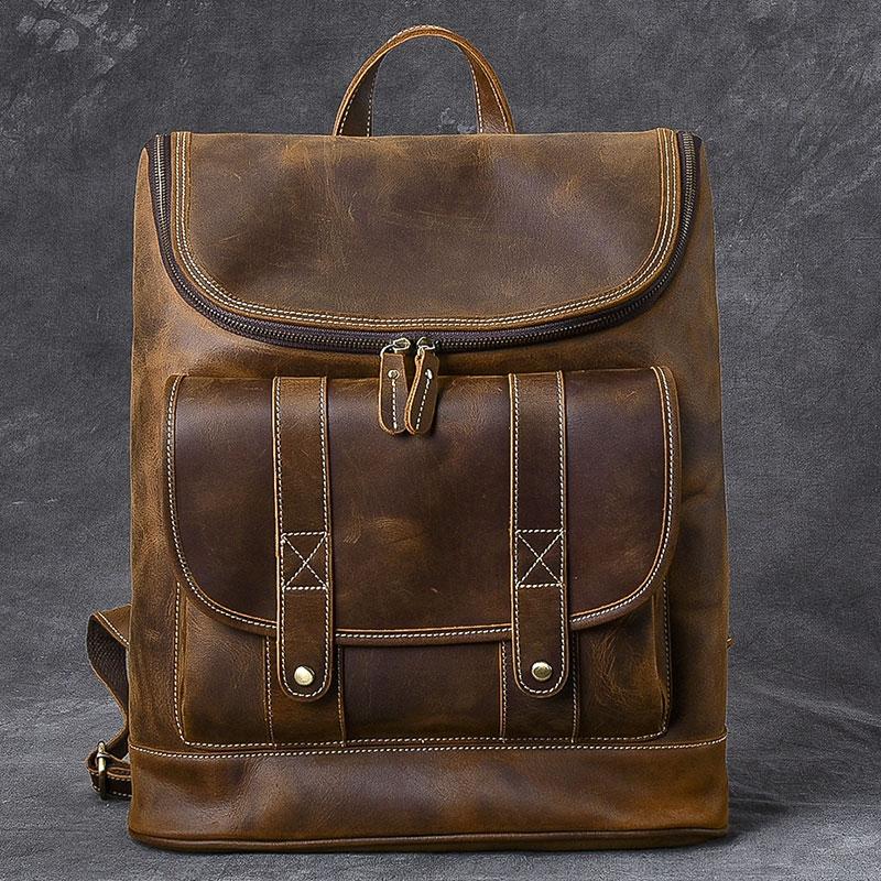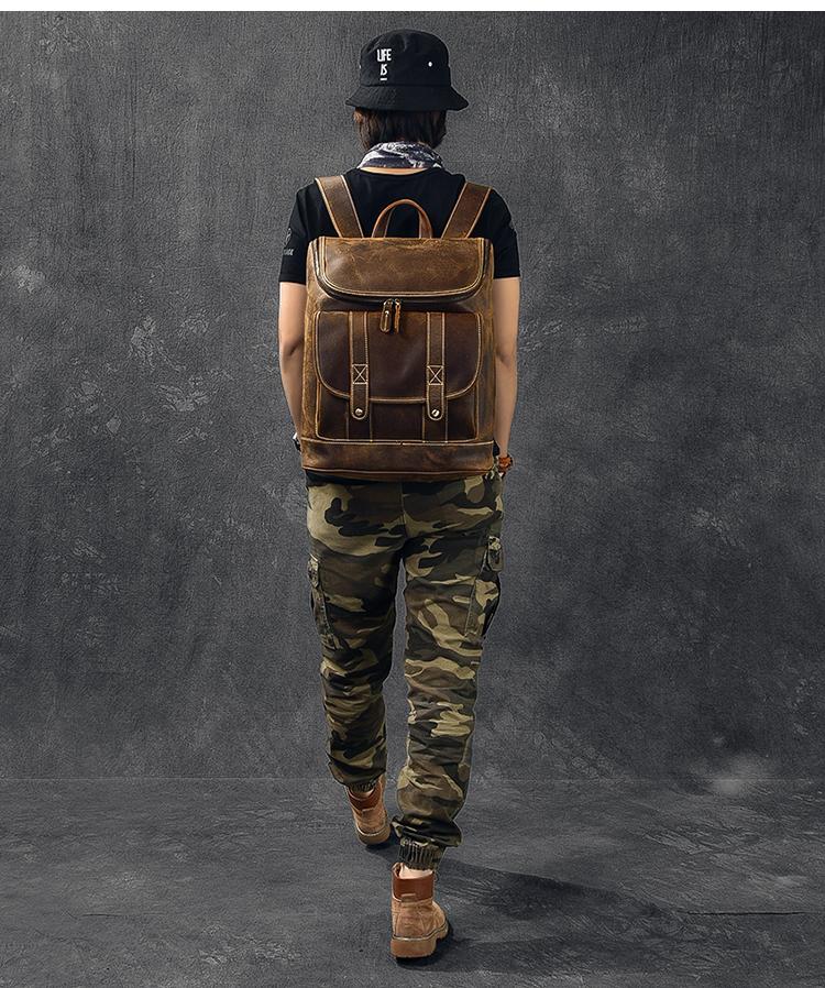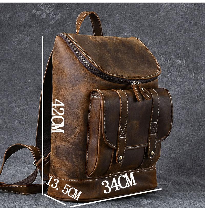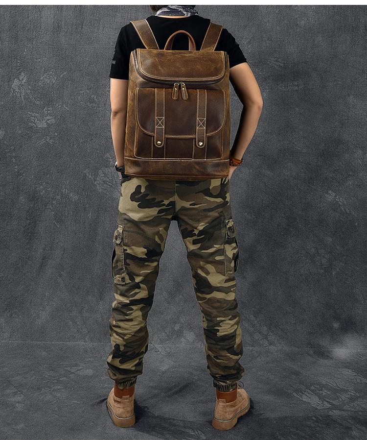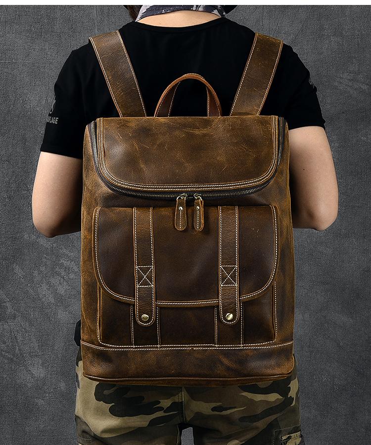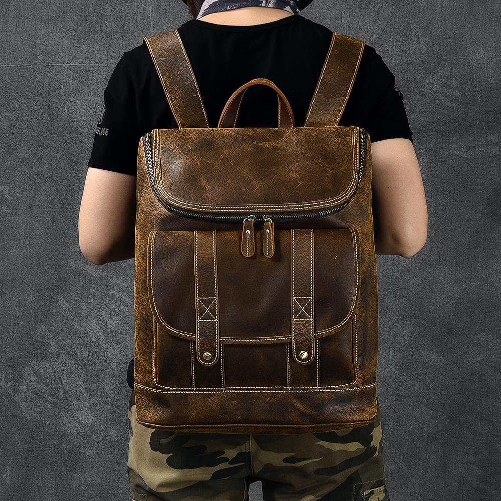 Design: Cool Leather Mens 15" Retro Brown Hiking Backpack Travel Backpack Computer Backpack for Men