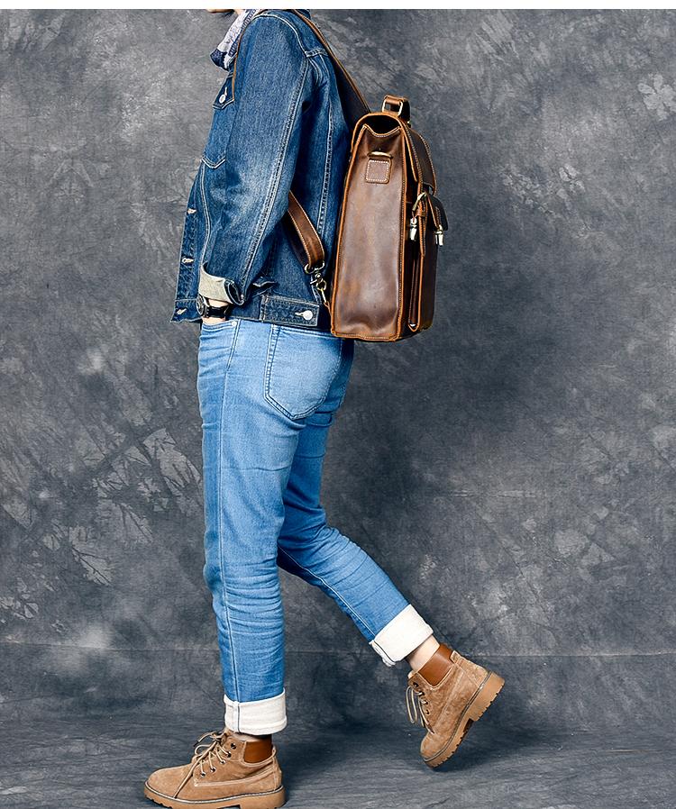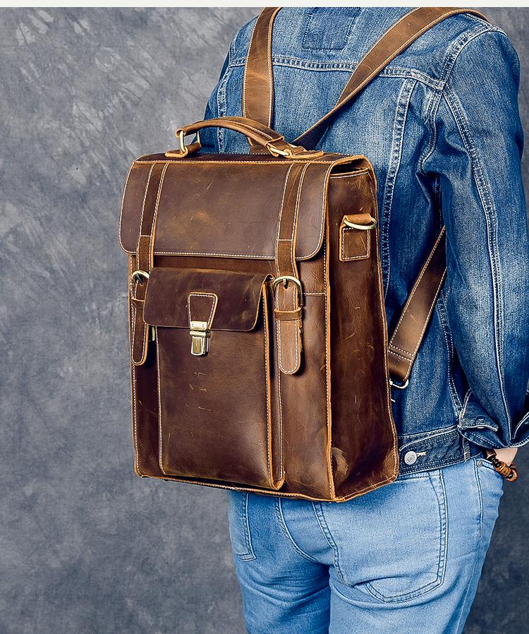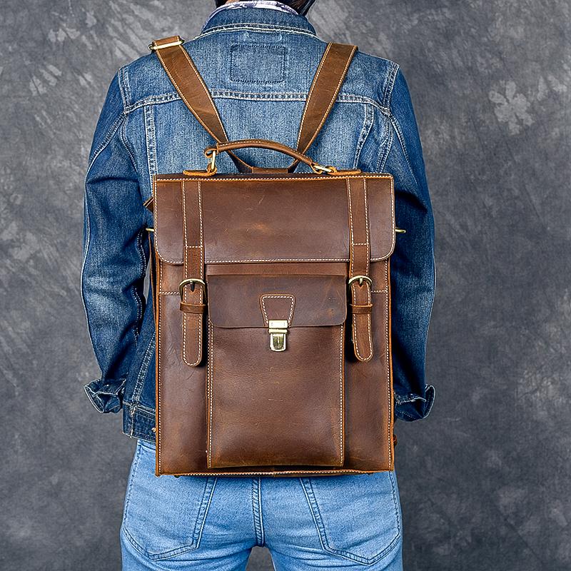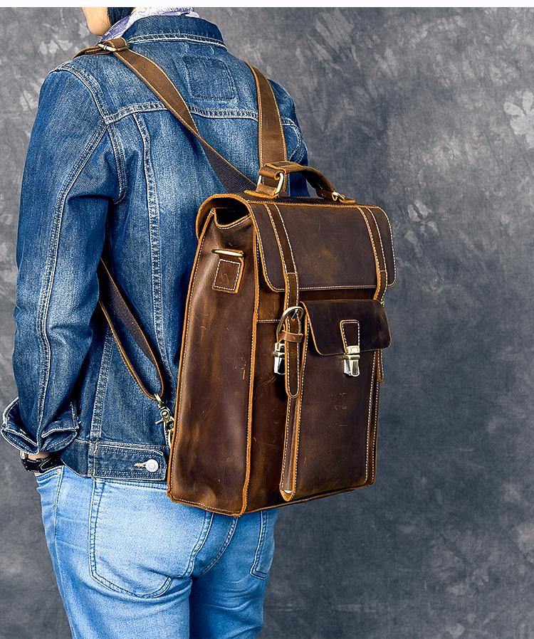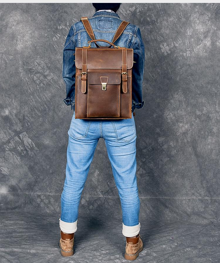 Design: Waxed Canvas Leather Mens 14" Brown Computer Backpack Dark Brown Travel Backpack College Backpack for Men