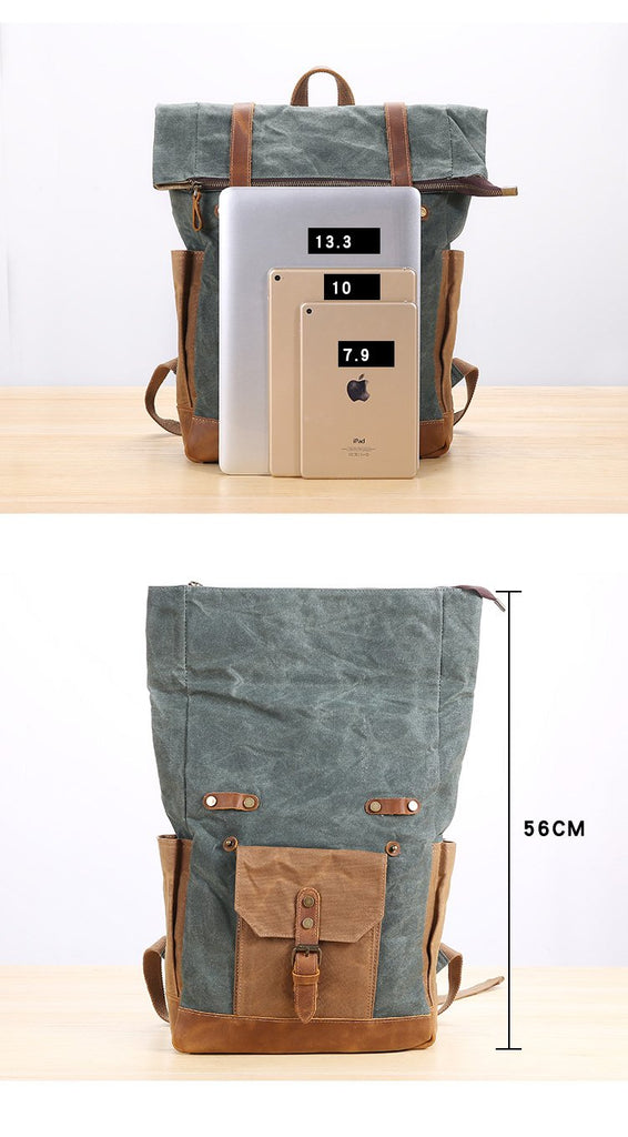 Style: Waxed Canvas Leather Mens 17‘’ Lake Green Backpack Khaki Travel Backpack Dark Gray Hiking Backpack for Men