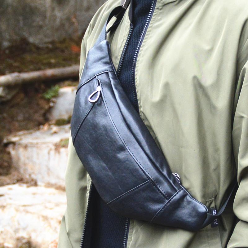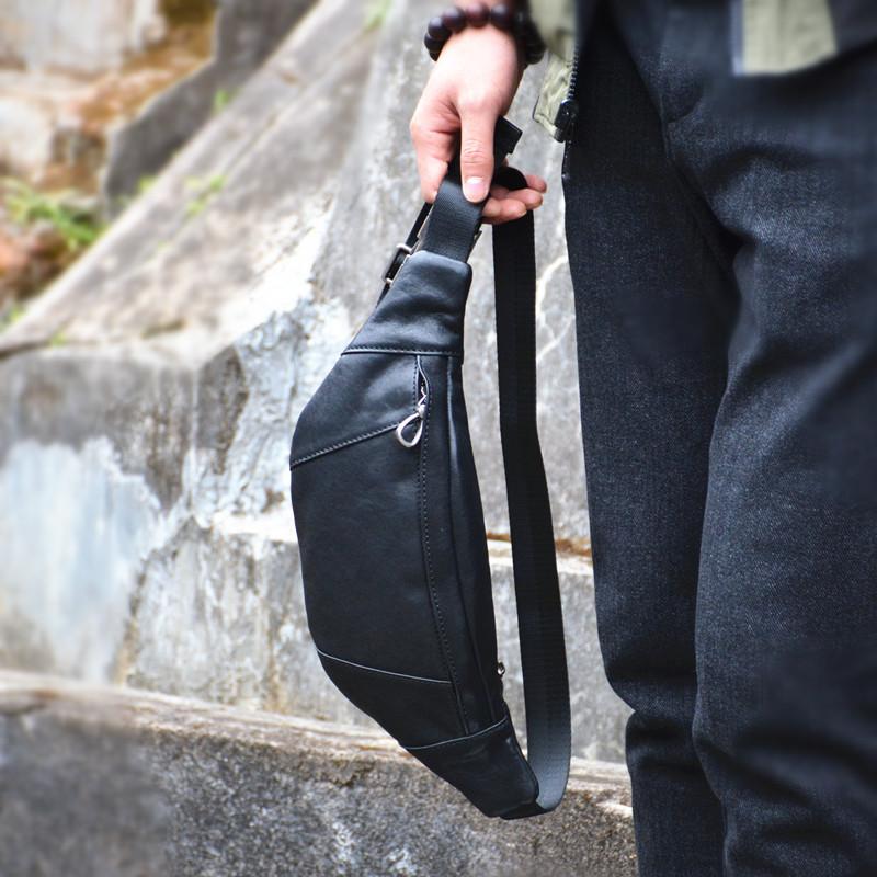 Design: Small Black Leather Fanny Pack Men's Leather Chest Bag Black Leather Hip Bag Small Waist Bags For Men