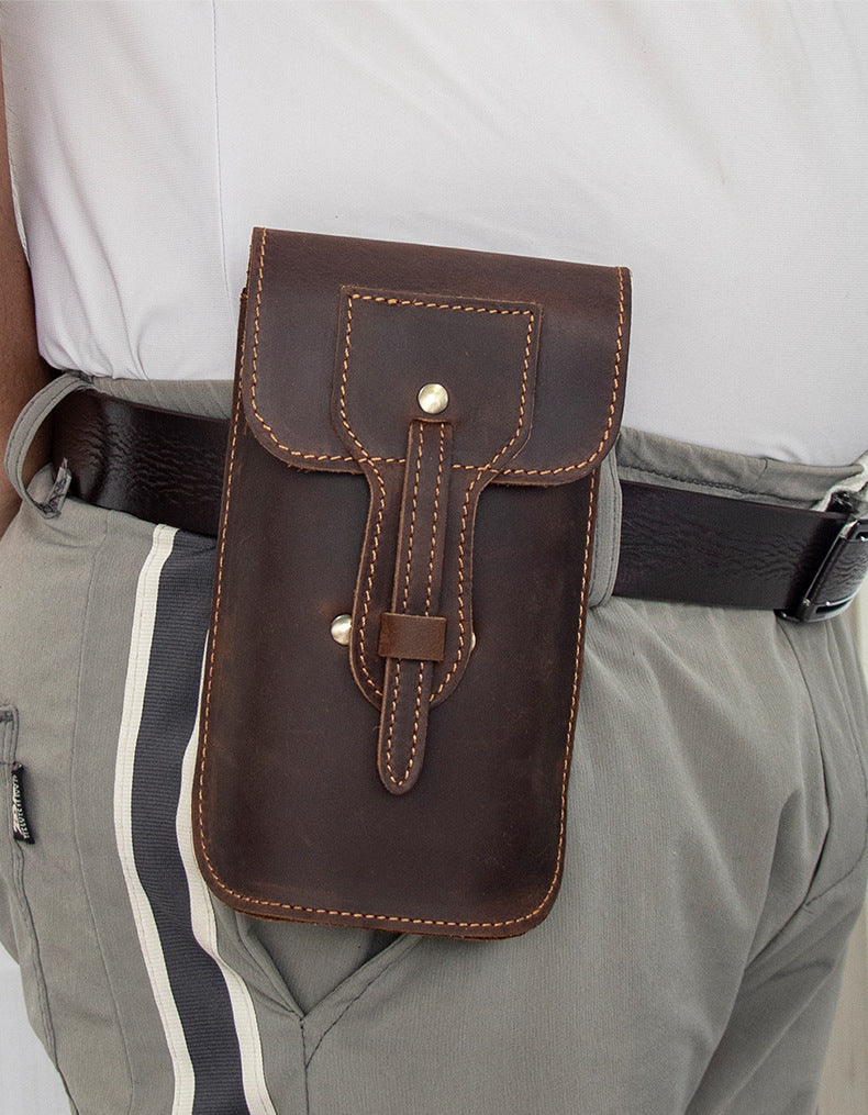Meet the perfect blend of hands-free convenience and rugged style with our Leather Belt Phone Pouch, a compact yet highly functional accessory designed for the modern man on the move. Crafted from genuine full-grain crazy horse leather, this versatile Leather Phone Belt Pouch measures 19cm x 11cm x 3cm and is available in two rich, masculine shades—Brown and Dark Brown. Featuring a vertical zippered front pocket, two spacious main compartments, and a convenient pen slot, this pouch keeps your essentials organized and accessible while freeing your hands for daily tasks.