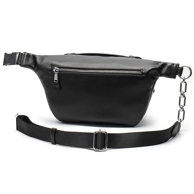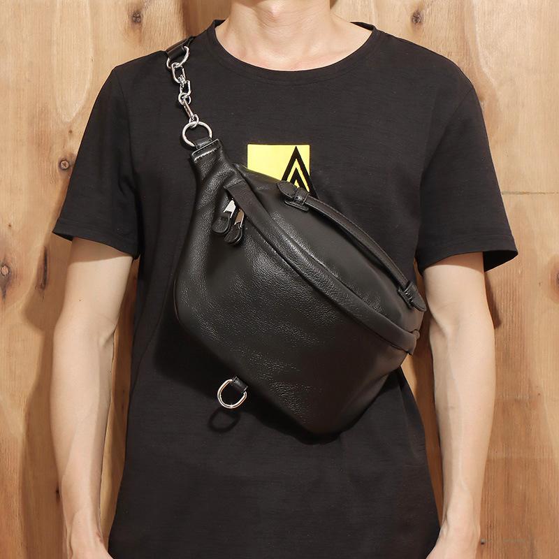 At the belt part, a short chain adds a fashionable accent that gives the bag a unique, edgy look. This detail, combined with the sleek leather, creates a chic and modern aesthetic that appeals to both men and women.