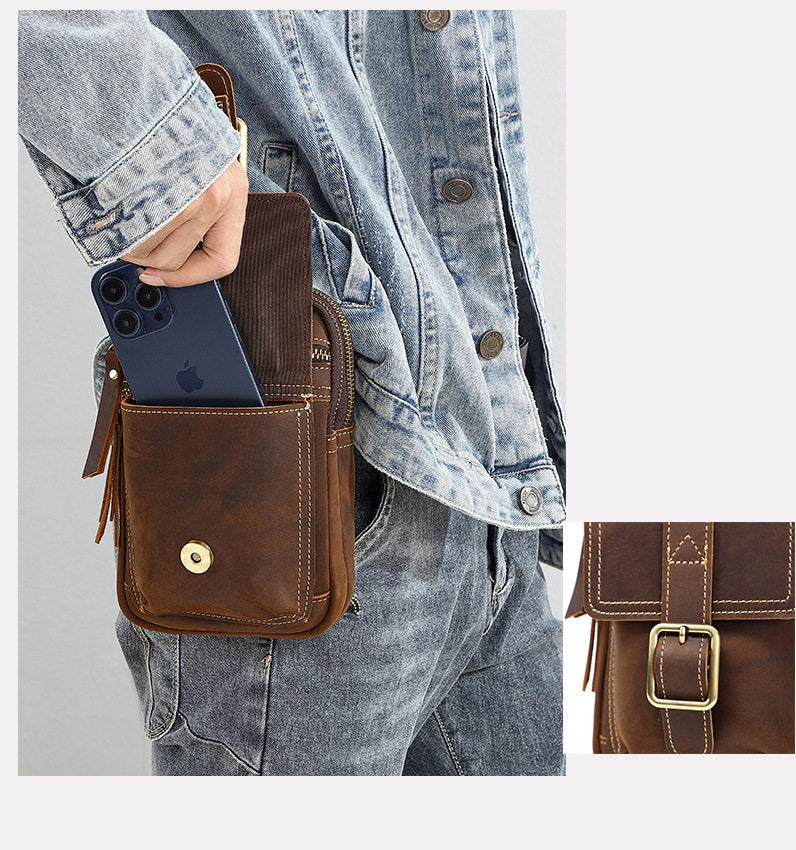 Introducing the ultimate in hands-free versatility with our Leather Belts Pouches, a rugged and intelligently designed accessory that adapts to your daily needs. Expertly crafted from 100% full-grain crazy horse leather, this versatile Belt Loop Pouch measures 19cm x 13cm x 5cm, offering substantial storage in a compact, vintage-inspired silhouette. Available in two rich, masculine shades—Classic Brown and Coffee Brown—this durable Small Leather Pouch for Belt combines old-world charm with modern-day convenience, making it the perfect companion for commuting, travel, festivals, and everyday adventures.