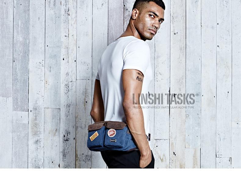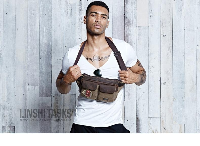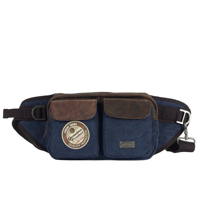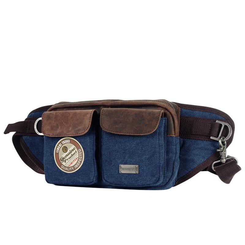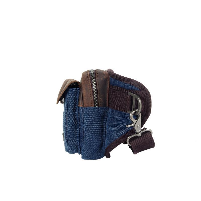 Design: Navy Blue Canvas Leather Fanny Pack Men's Brown Chest Bag Sling Hip Bag Waist Bag For Men