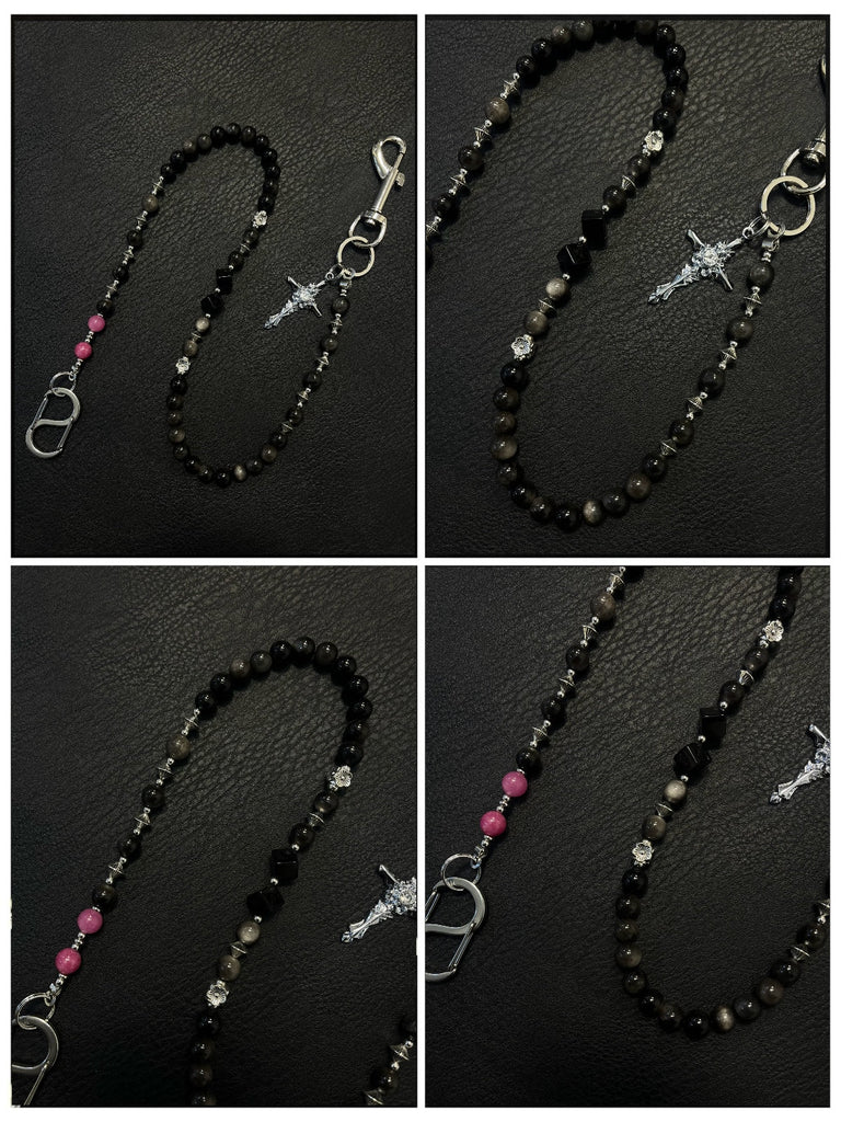 Gothic Elegance Beaded Wallet Chain �Obsidian Stone & Cross Charm