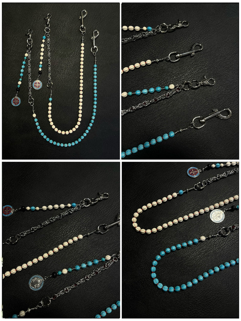 Discover a truly divine accessory with our exquisite beaded Wallet Chain, where spiritual symbolism meets alternative fashion. This 78cm masterpiece combines pristine white howlite stone beads with captivating turquoise-blue accents, creating a celestial color palette that transcends ordinary accessory design. The chain features a unique short extension near the clasp, culminating in a meaningful Saint Benedict Medal, making this beaded pants chain both a protective talisman and a style statement.