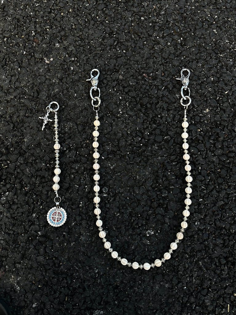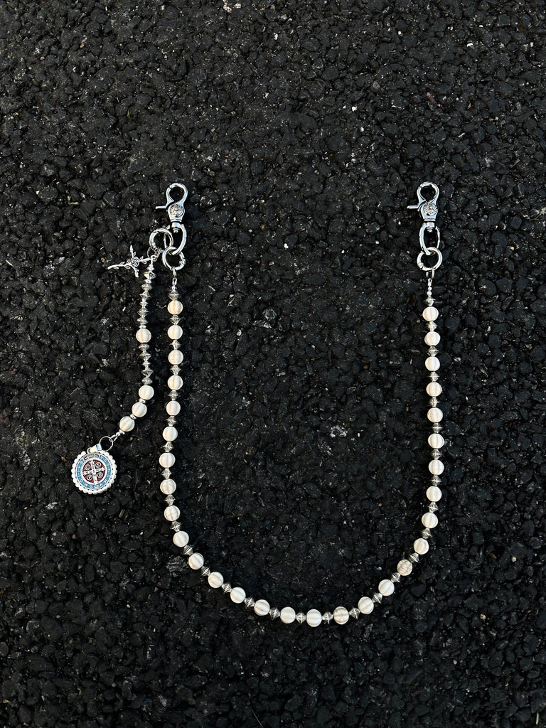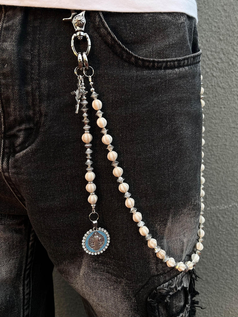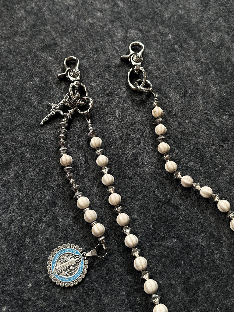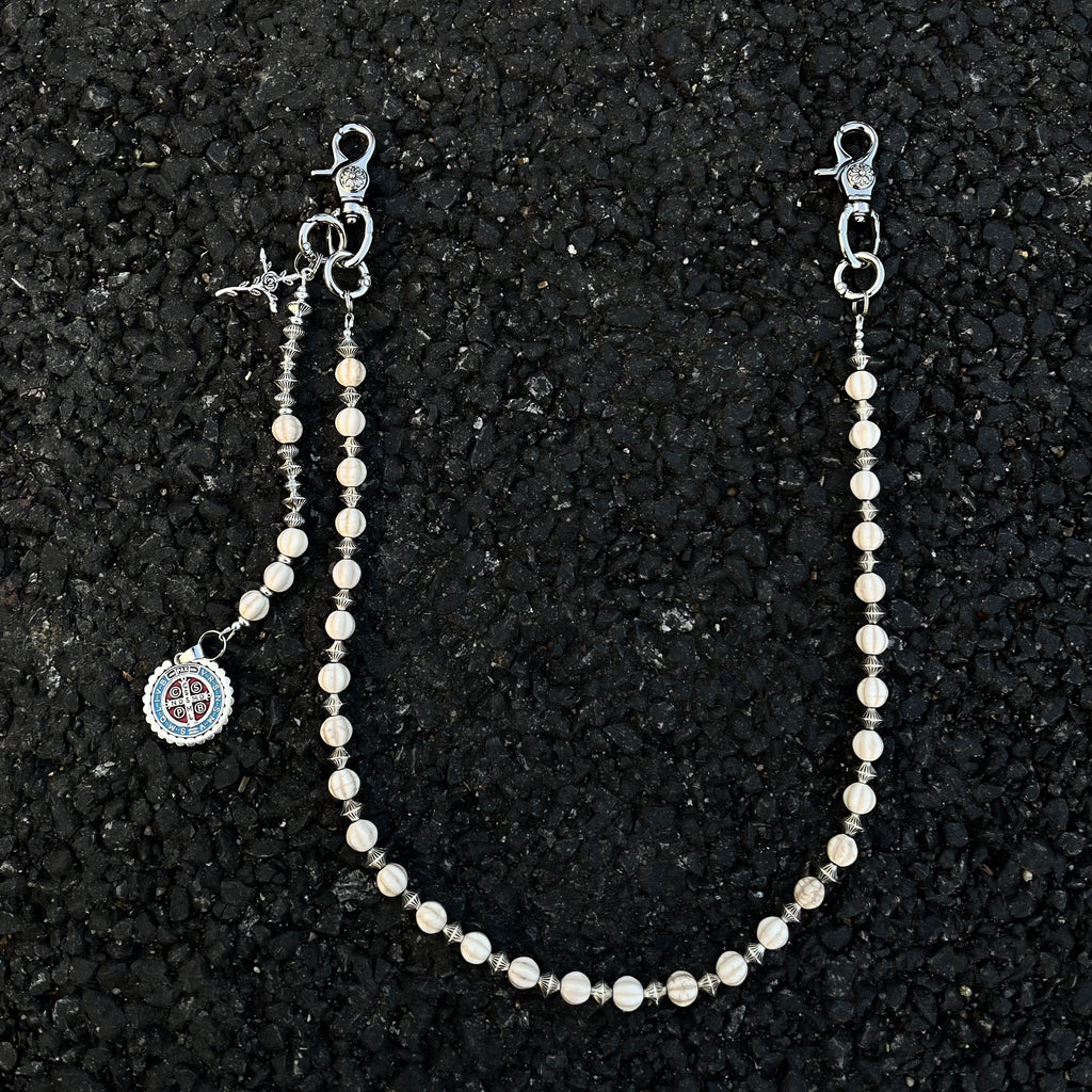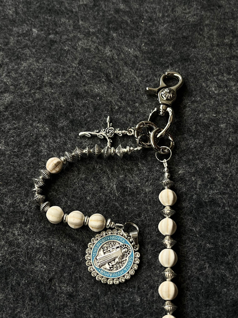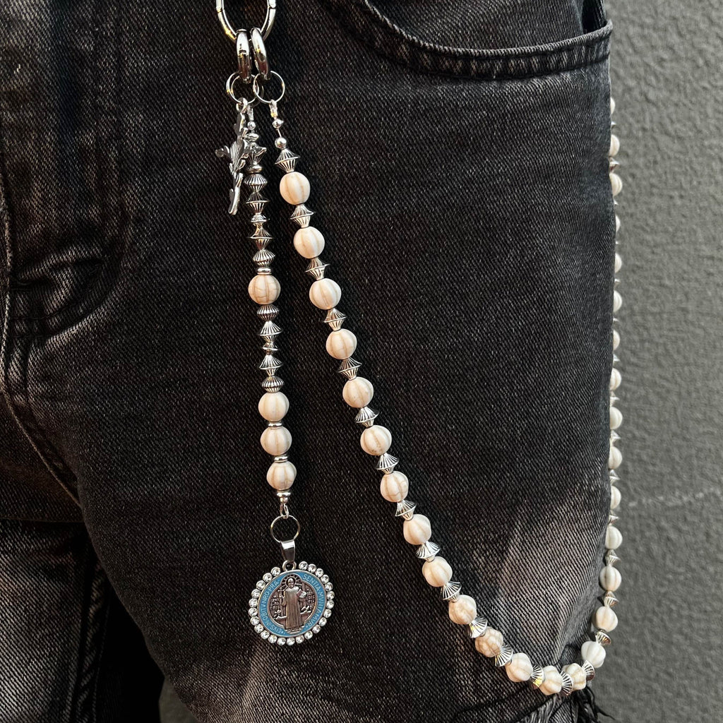 Discover a truly unique accessory with our Ball Wallet Chain, where natural elegance meets spiritual symbolism. This 68cm chain features genuine white howlite stone beads, artfully interspersed with metallic UFO-shaped spacer beads that create a captivating celestial rhythm. The chain is finished with a meaningful auxiliary strand featuring both a cross pendant and a Saint Benedict Medal, adding layers of spiritual significance to this exceptional Ball Pants Chain.