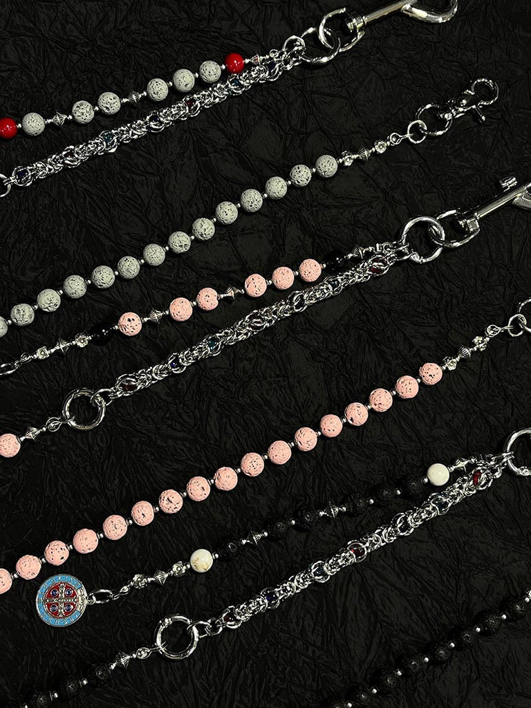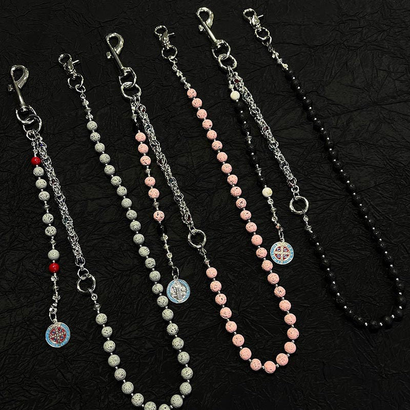 Discover the ultimate fusion of spiritual symbolism and alternative fashion with our versatile beaded Wallet Chain. This 78cm masterpiece features genuine lavastone beads in three captivating colors �classic Black, sophisticated Gray, and soft Pink �each offering a unique aesthetic for personal expression. The chain is enhanced with a meaningful Saint Benedict Medal suspended from a short auxiliary chain near the clasp, adding both spiritual significance and visual depth to this exceptional beaded pants chain.