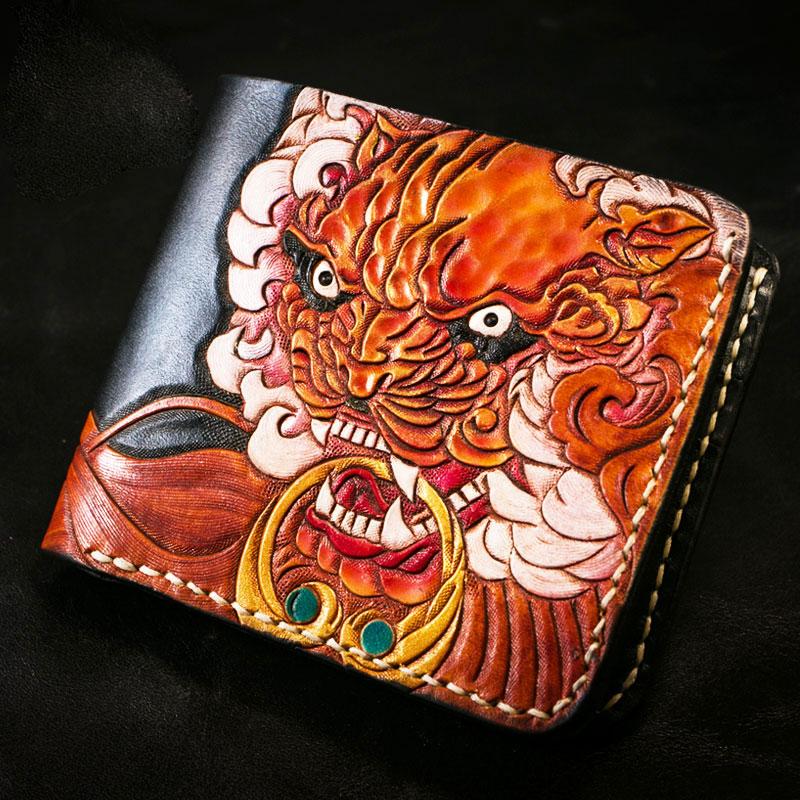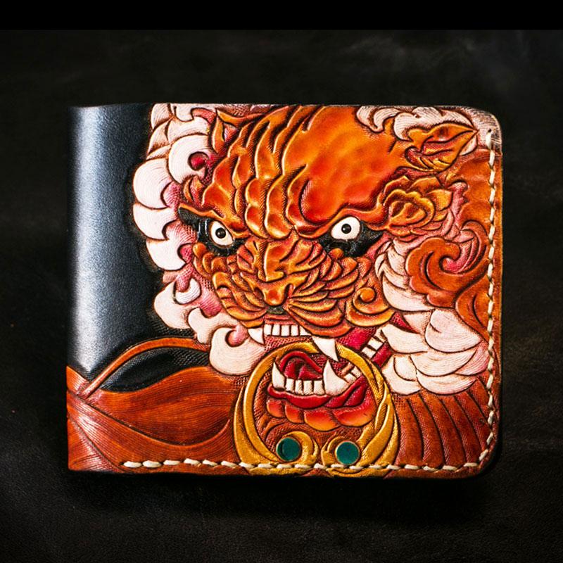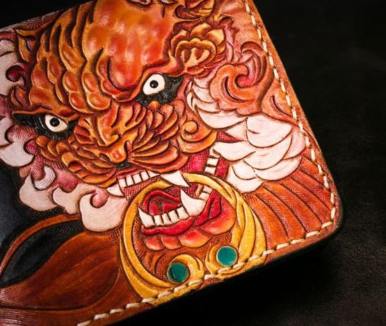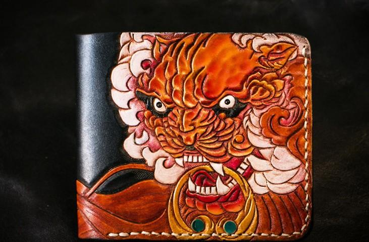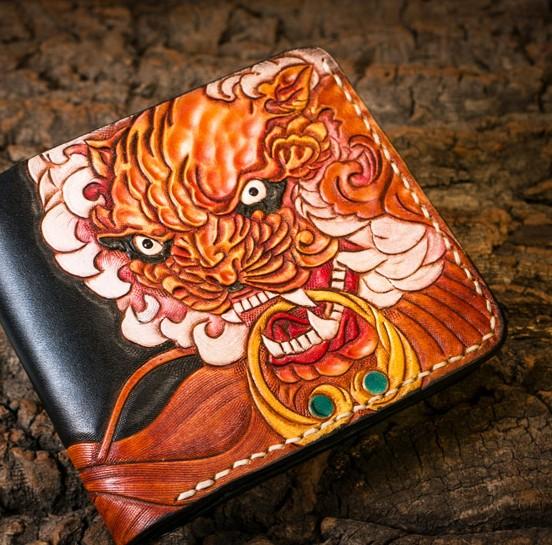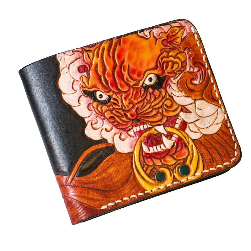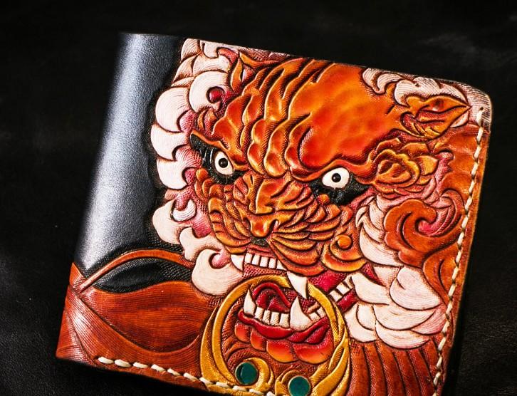 Design: Handmade Leather Chinese Lion Tooled Mens billfold Wallet Cool Leather Wallet Slim Wallet for Men