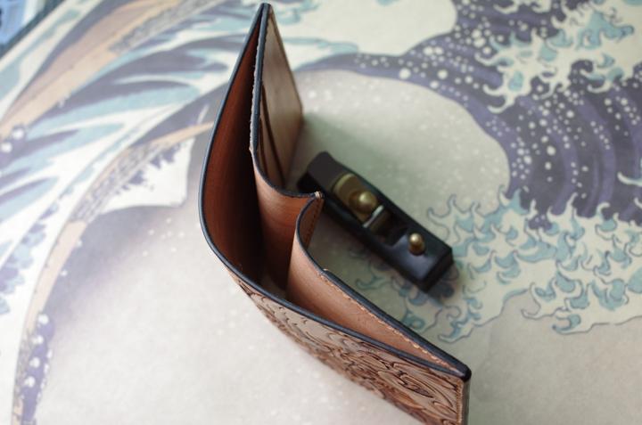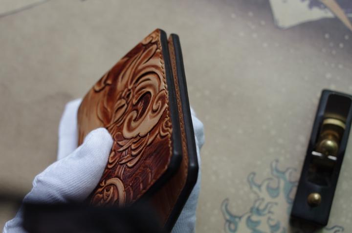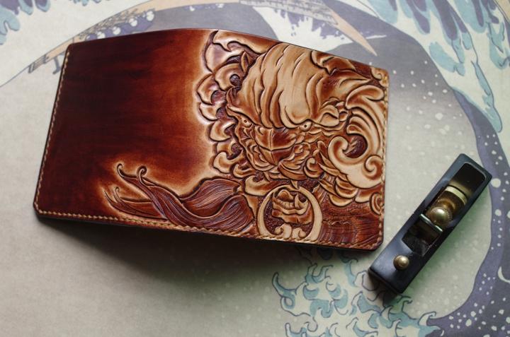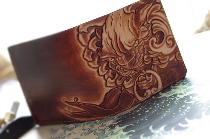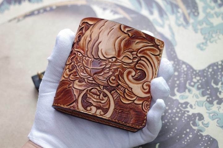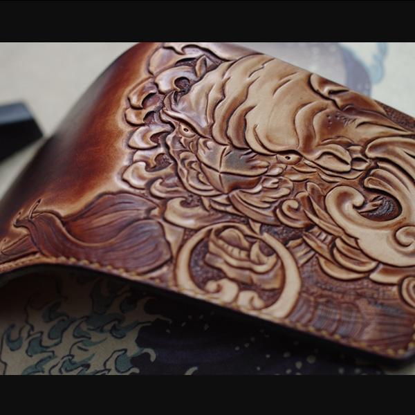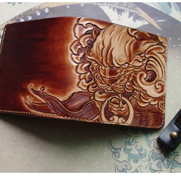Design: Handmade Leather Chinese Lion Tooled Mens billfold Wallet Cool Slim Wallet Biker Wallet for Men
