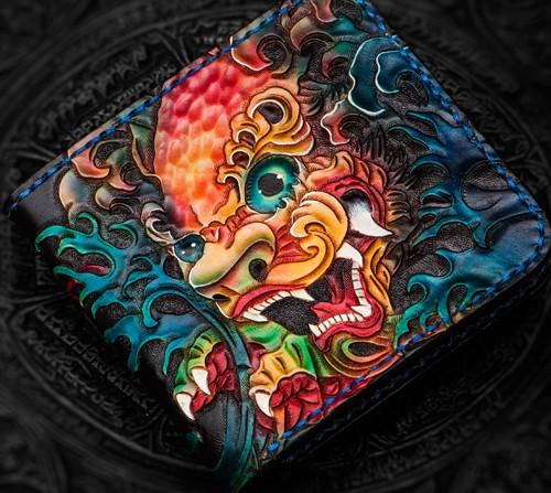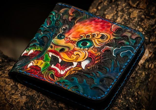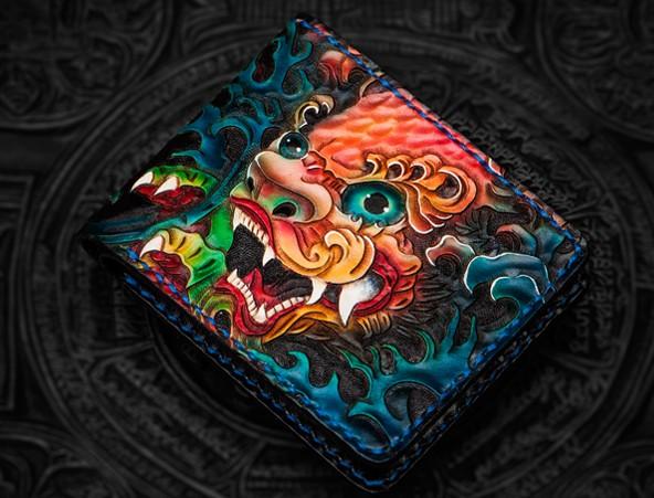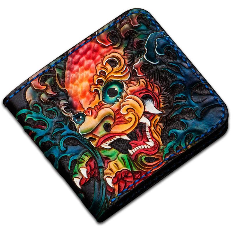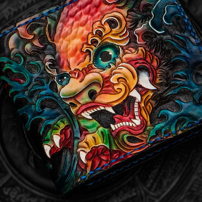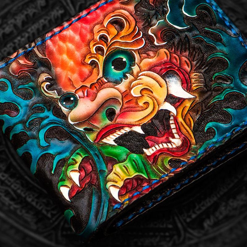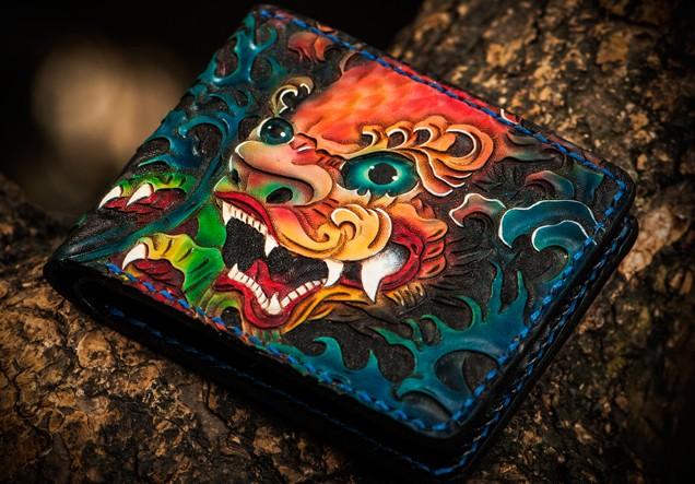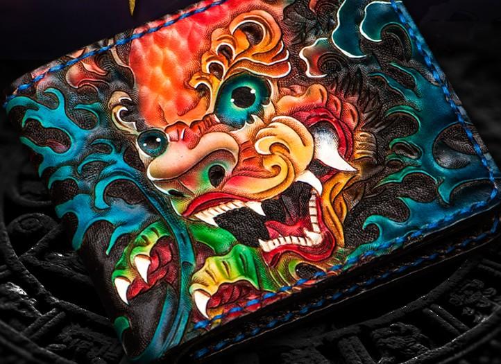 Design: Handmade Leather Tooled Chinese Lion Mens billfold Wallet Cool Slim Wallet Biker Wallet for Men