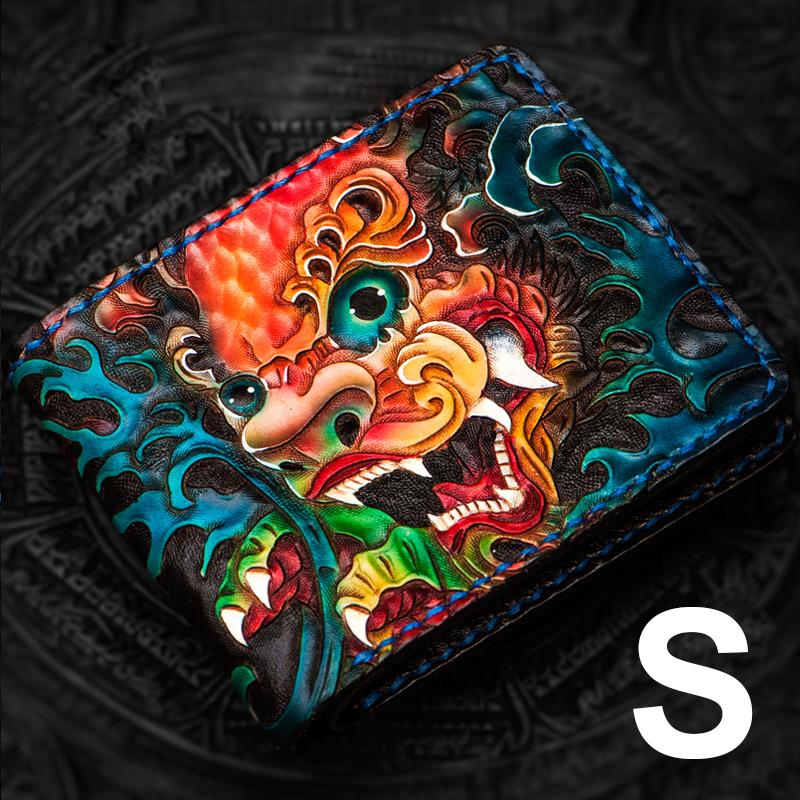 Style: Handmade Leather Tooled Chinese Lion Mens billfold Wallet Cool Slim Wallet Biker Wallet for Men