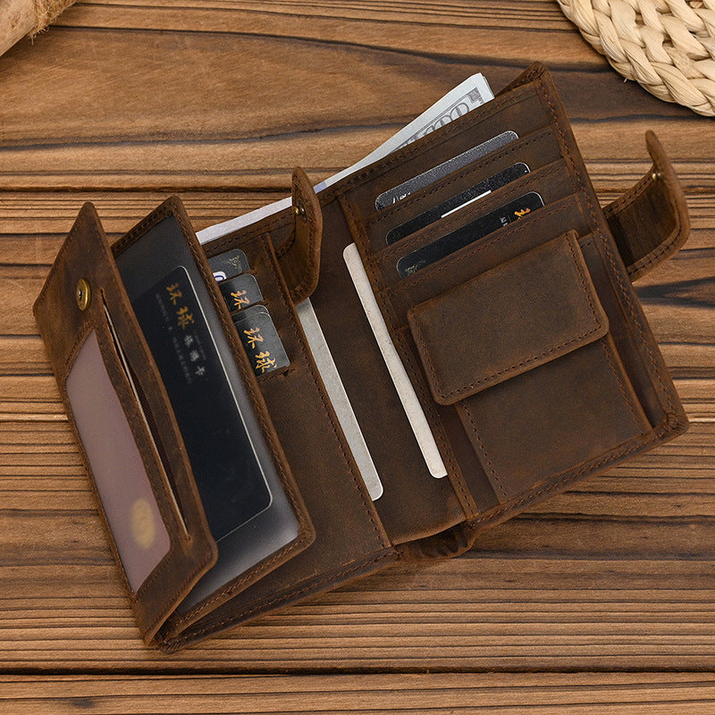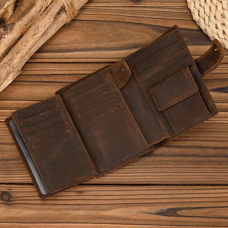 Discover the perfect fusion of classic craftsmanship and modern functionality with our wallet with buckle, a meticulously designed accessory that combines vintage elegance with unparalleled organization. This compact leather vertical bifold wallet measures 11.2cm x 9cm x 2cm, crafted from premium full-grain crazy horse leather in a rich dark brown hue. Despite its slim profile, this wallet boasts an impressive 11 card slots, 3 ID windows, a full bill compartment, 2 hidden card slots, a flip-top coin pocket, and a secure zippered pocket—making it the ultimate choice for those who carry multiple cards and essentials while maintaining a refined, minimalist aesthetic.