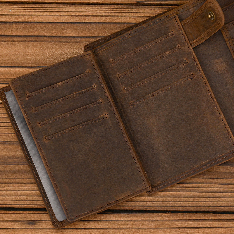 The defining feature of this exceptional wallet with buckle is its authentic leather buckle closure, which ensures your belongings remain securely fastened even when the wallet is fully loaded. The crazy horse leather develops a unique patina over time, enhancing its vintage character and making it a timeless companion for daily use. Whether you’re a fan of retro style or simply appreciate practical design, this leather vertical bifold wallet delivers both style and substance.