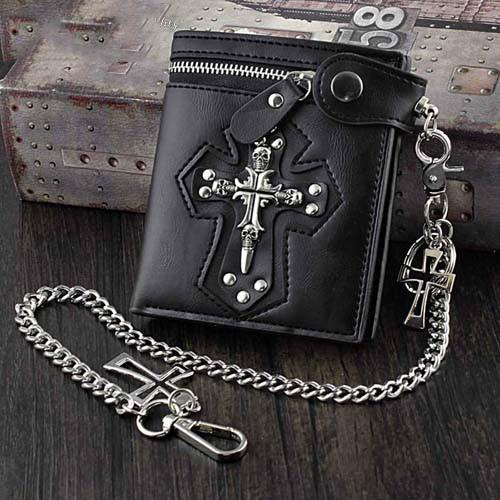 Design: Punk Black Leather Men's Small Biker Wallet Chain Wallet Skull Cross billfold Wallet with Chain For Men