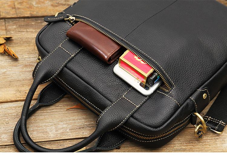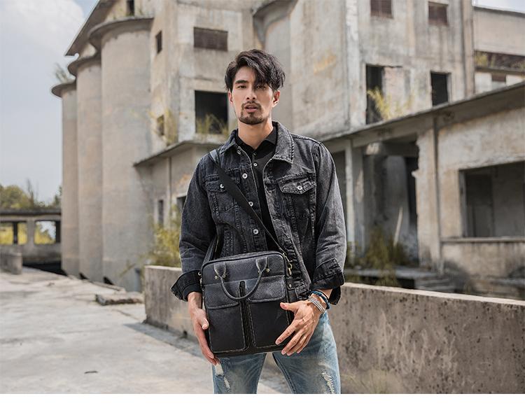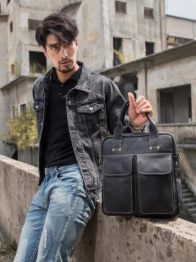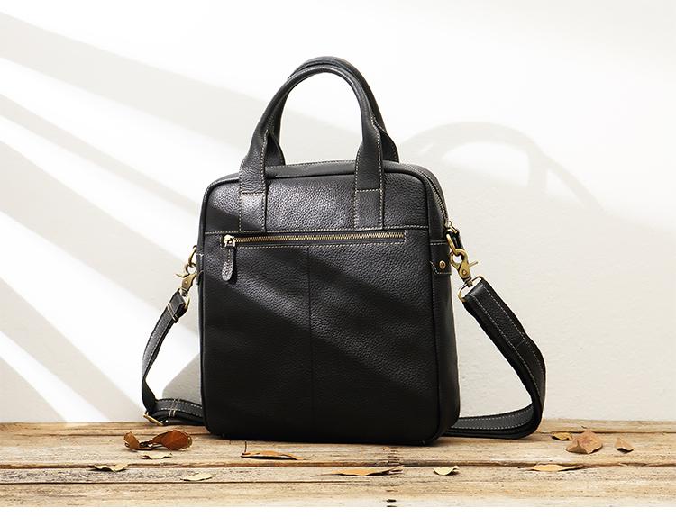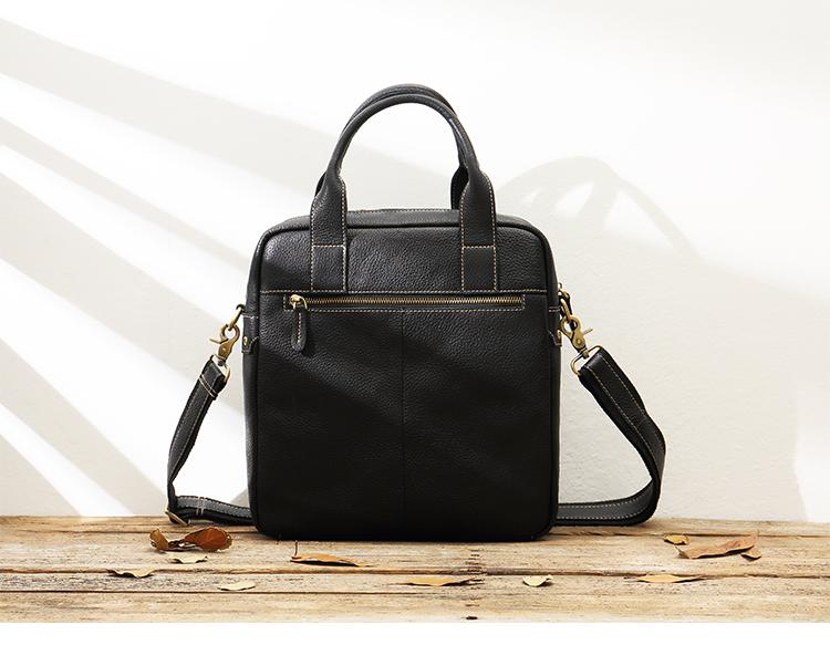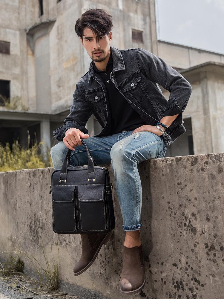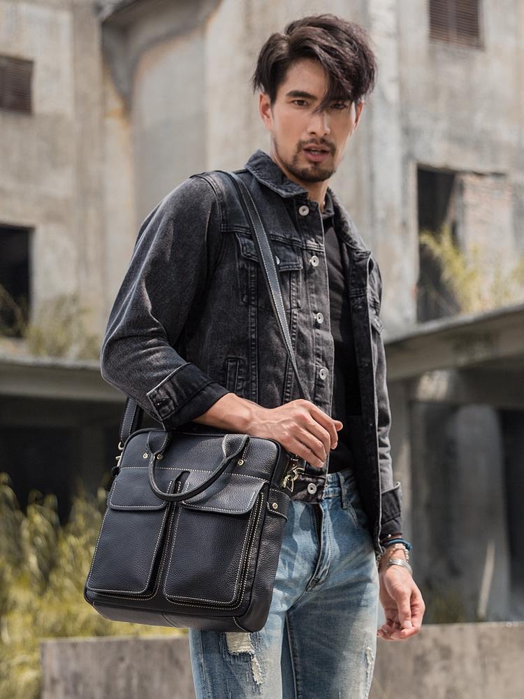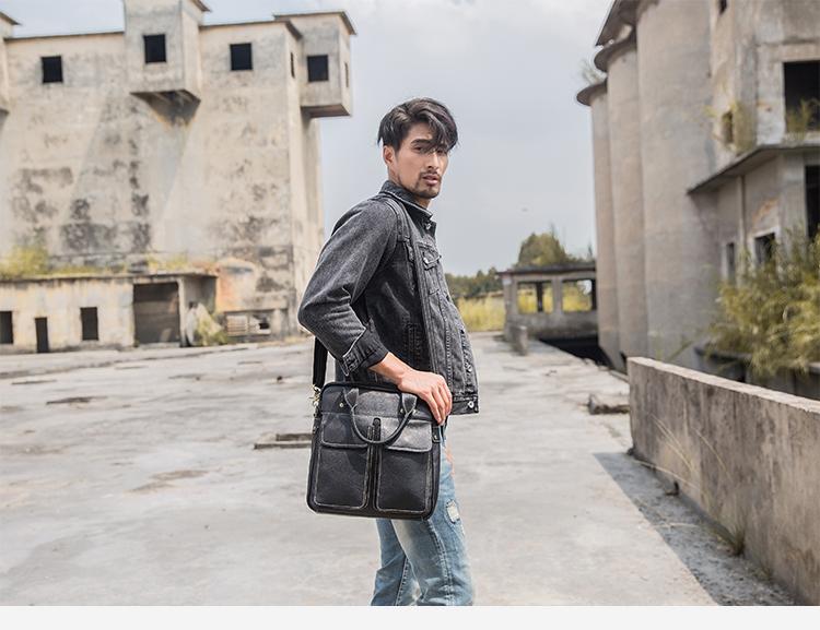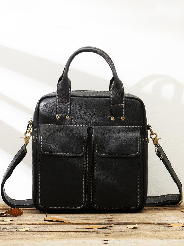 Black Casual Leather Mens 10 inches Vertical Briefcase Side Bags Postman Bag Black Work Bag Courier Bag for Men