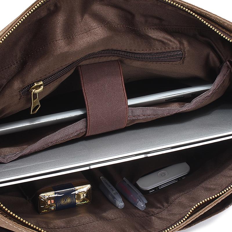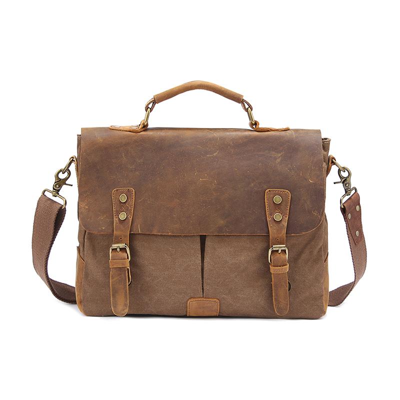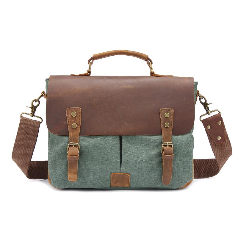 Canvas Leather Mens 14" Simple Khaki Briefcase Side Bag Lake Green Messenger Bag Brown Shoulder Bag for Men