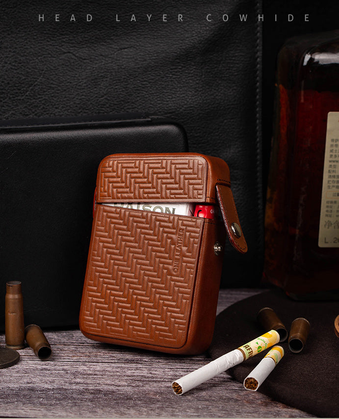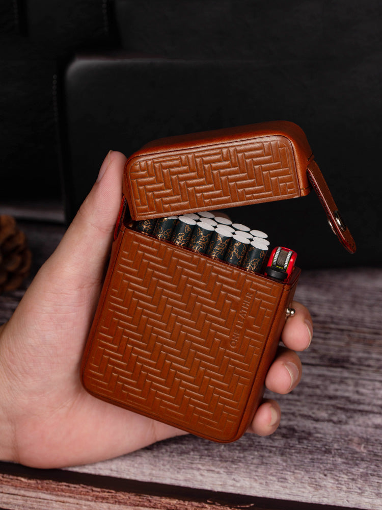 Style: Classic Leather Mens 20pcs Cigarette Holder Cases With Ligher Holder Brown Stamped Cigarette Case for Men
