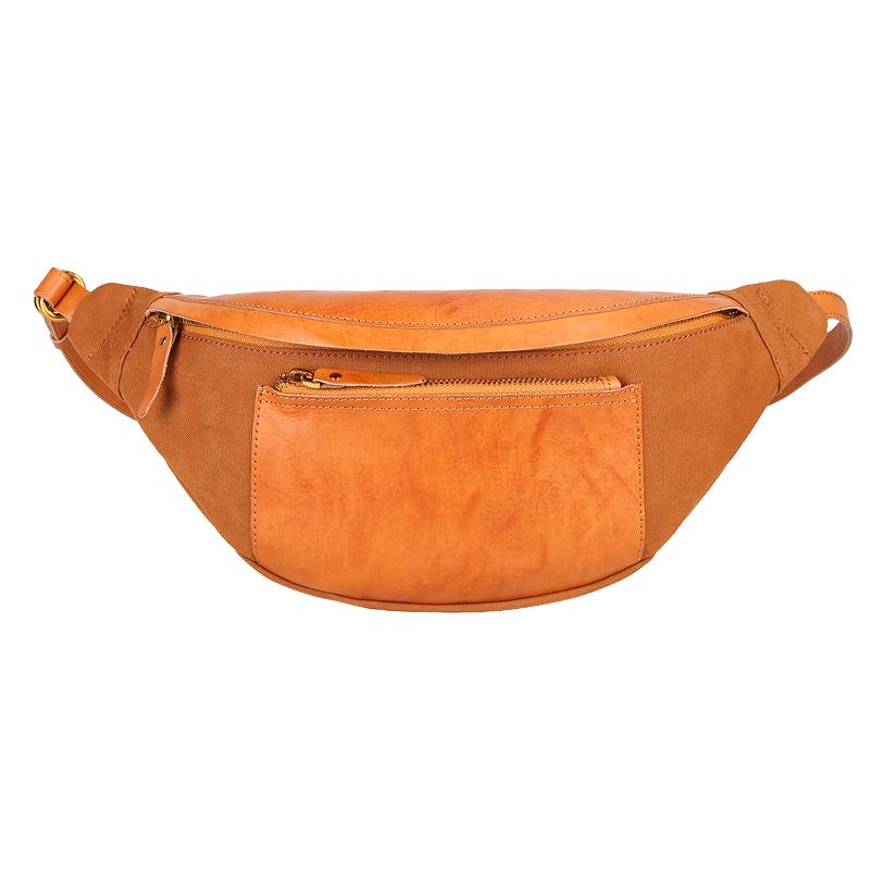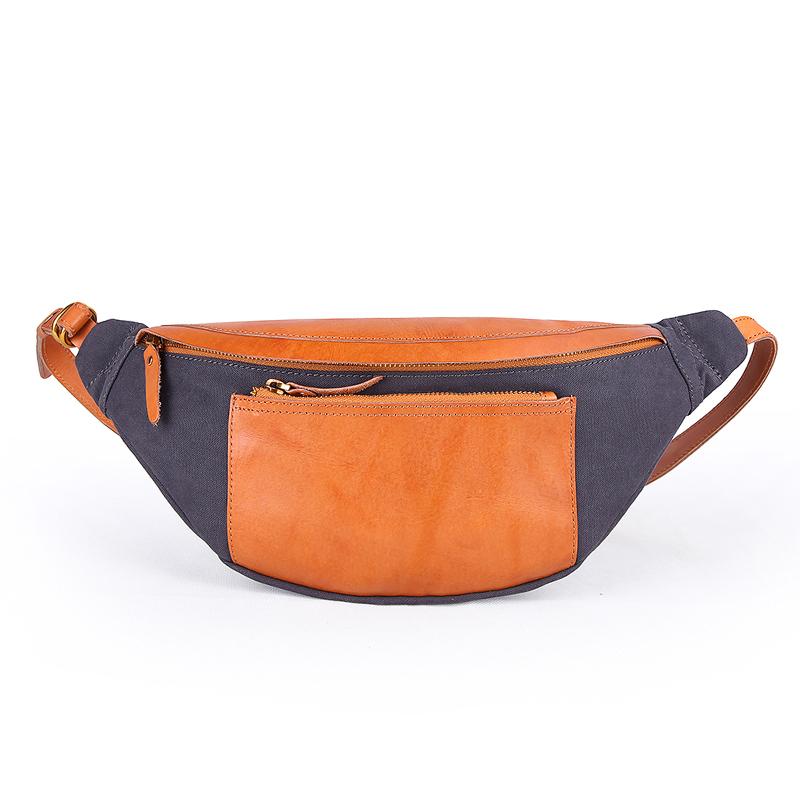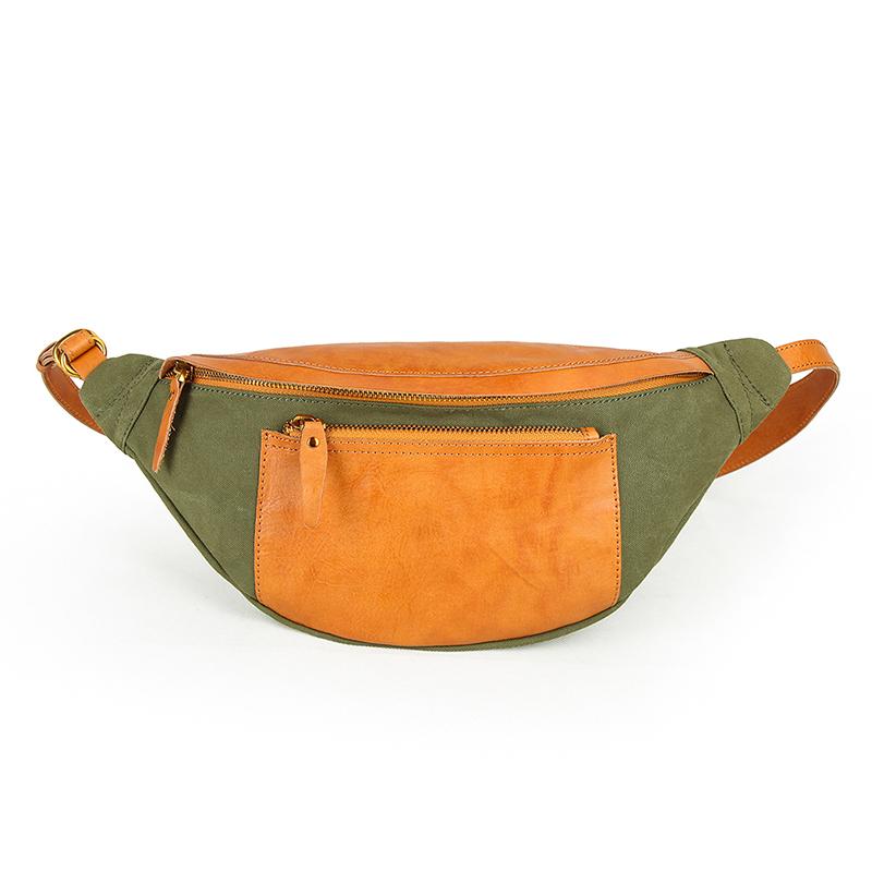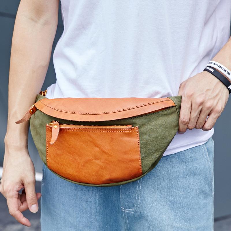 Style: Canvas Leather Mens Caramel Waist Bag Army Green Fanny Pack Hip pack Chest Bag For Men