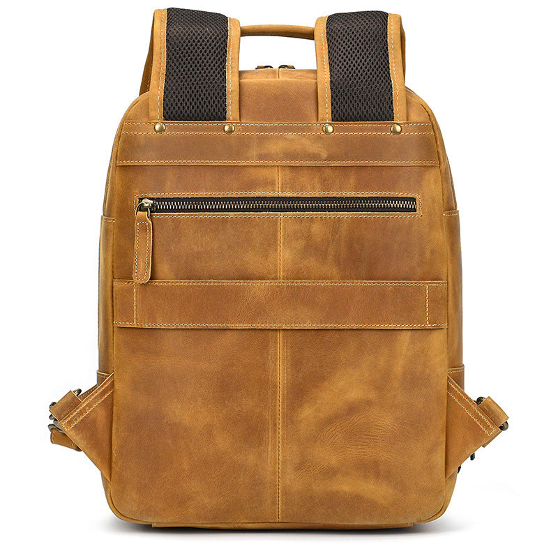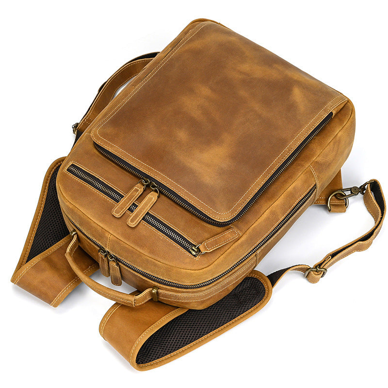 The thoughtful design of this camel leather backpack ensures that every item has its place, from your tech gadgets to your daily essentials. The crazy horse leather not only provides exceptional durability but also tells a story through its evolving patina, making this backpack uniquely yours over time. Whether you're navigating the urban jungle or traveling to new destinations, this backpack delivers both practical functionality and timeless style.