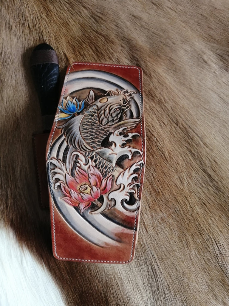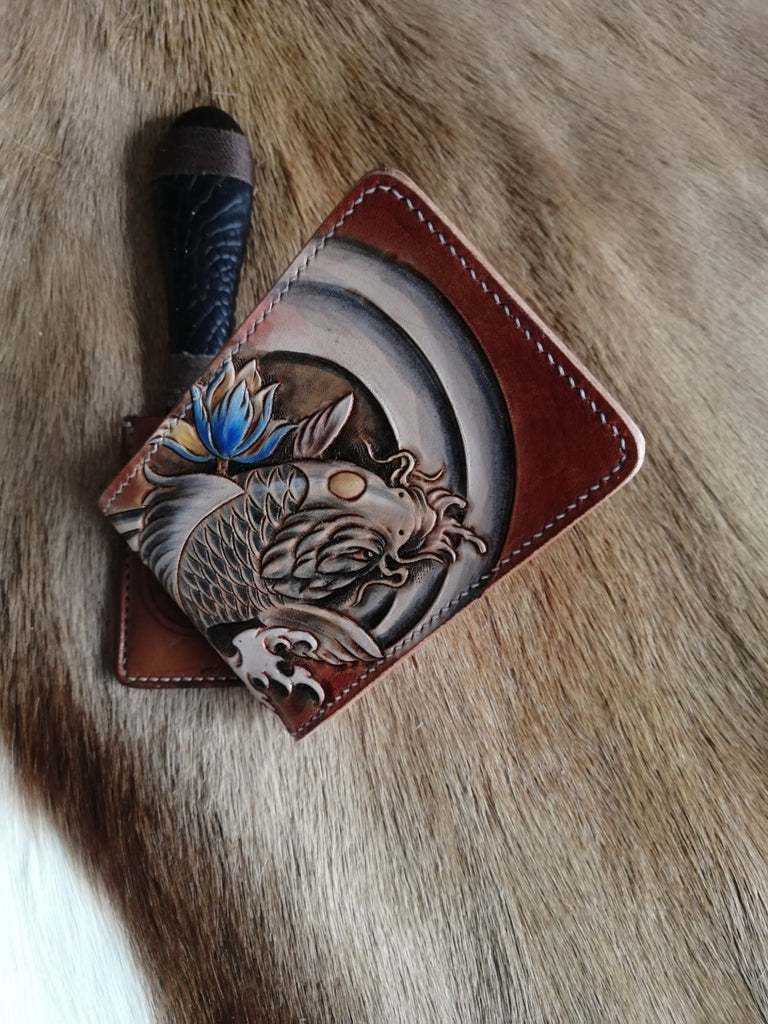 Style: Carp Tooled Leather Wallet Card Wallet with ID Window Koi ID Holder Wallet
