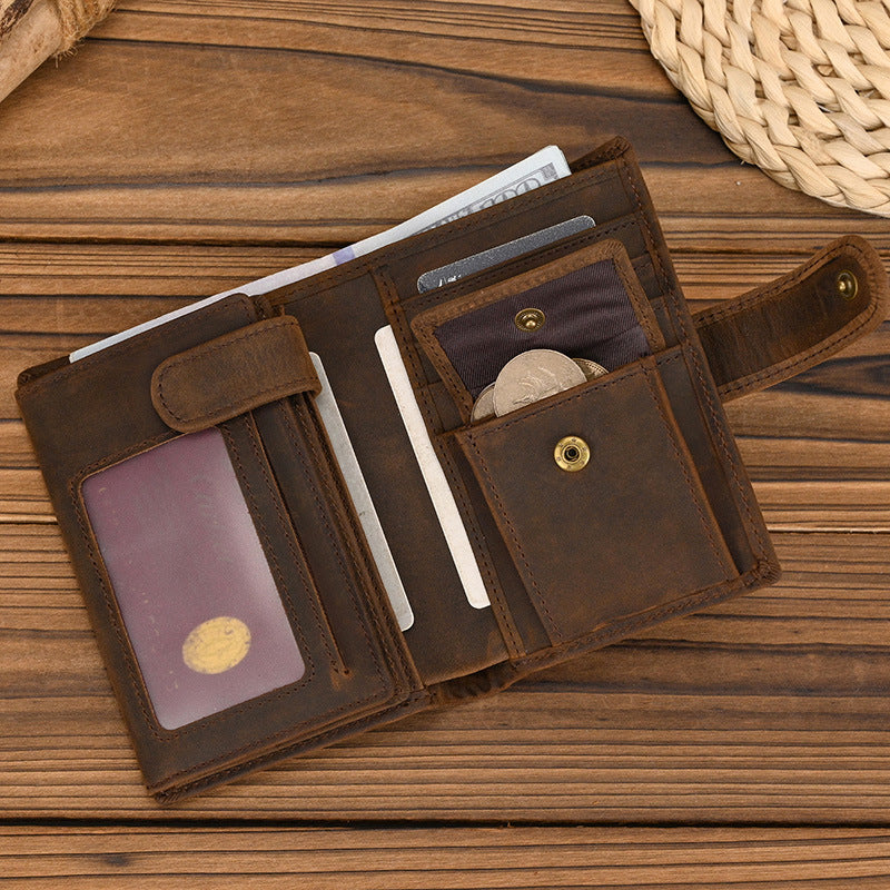 Discover the perfect fusion of classic craftsmanship and modern functionality with our wallet with buckle, a meticulously designed accessory that combines vintage elegance with unparalleled organization. This compact leather vertical bifold wallet measures 11.2cm x 9cm x 2cm, crafted from premium full-grain crazy horse leather in a rich dark brown hue. Despite its slim profile, this wallet boasts an impressive 11 card slots, 3 ID windows, a full bill compartment, 2 hidden card slots, a flip-top coin pocket, and a secure zippered pocket—making it the ultimate choice for those who carry multiple cards and essentials while maintaining a refined, minimalist aesthetic.