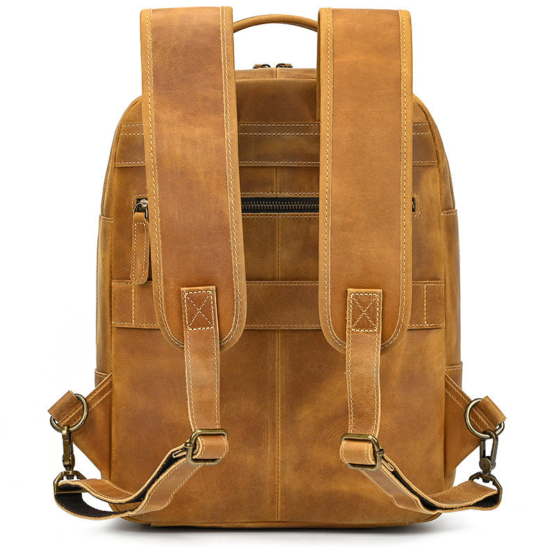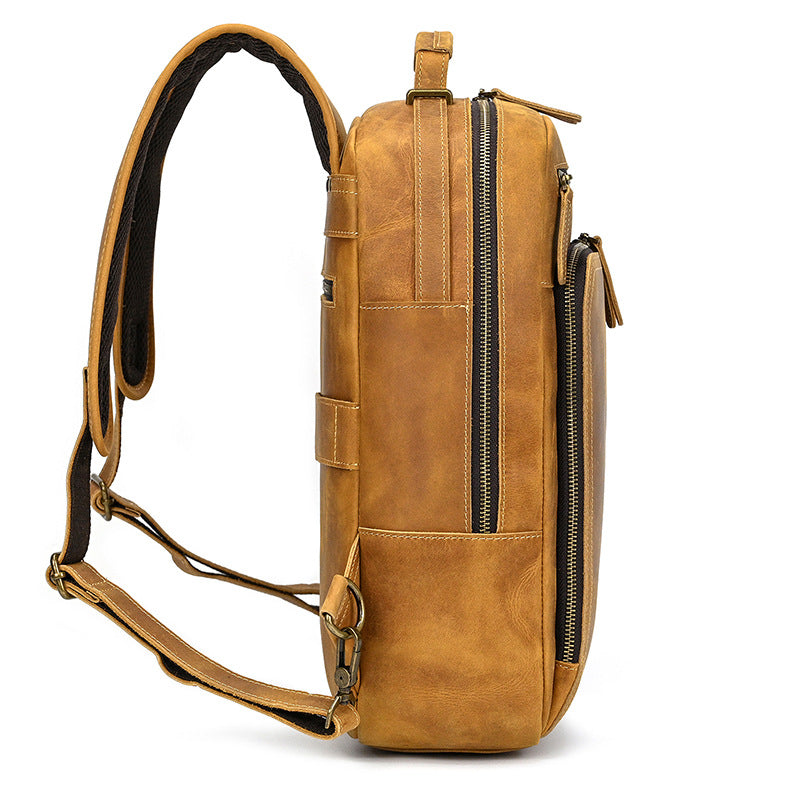 The thoughtful design of this camel leather backpack ensures that every item has its place, from your tech gadgets to your daily essentials. The crazy horse leather not only provides exceptional durability but also tells a story through its evolving patina, making this backpack uniquely yours over time. Whether you're navigating the urban jungle or traveling to new destinations, this backpack delivers both practical functionality and timeless style.
