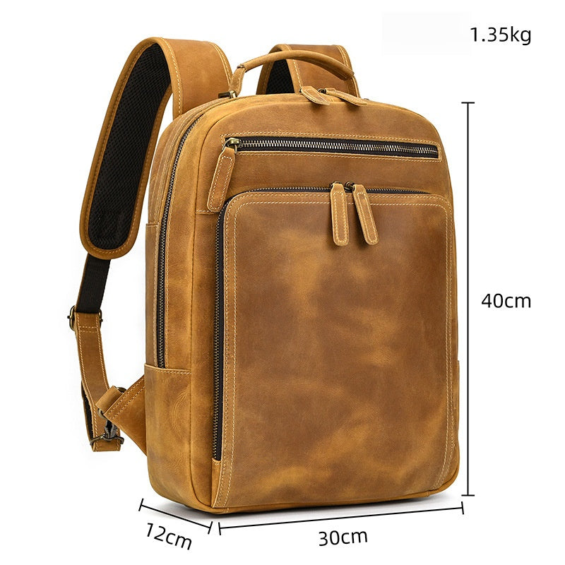 Discover the perfect fusion of rugged durability and smart organization with our premium crazy horse leather backpack, a masterfully crafted bag designed for the modern man who values both style and functionality. This versatile camel leather backpack measures 40cm x 30cm x 12cm with a spacious 14L capacity, weighing just 1.35kg for comfortable all-day carry. Meticulously constructed from full-grain crazy horse leather that develops a unique patina over time, this exceptional leather backpack combines vintage aesthetics with contemporary organizational features, making it the ideal choice for commuting, travel, and daily adventures.