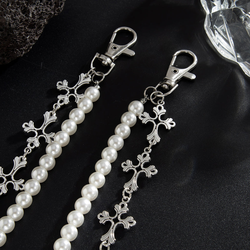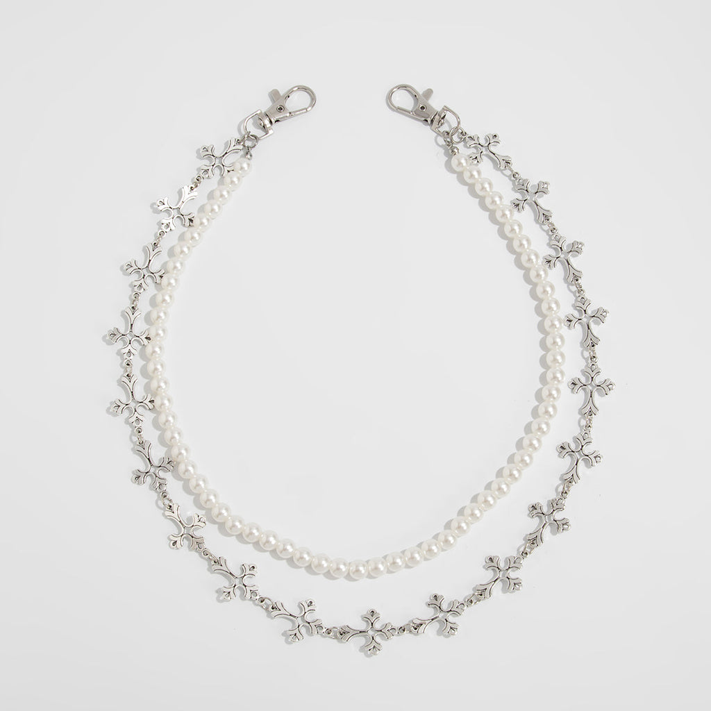Discover the perfect fusion of edgy symbolism and feminine elegance with our exquisite Pearl Wallet Chain, a beautifully layered accessory designed for the modern woman. This unique Double Wallet Chain features a striking 60cm outer strand of interconnected cross pendants, artfully linked to create a continuous spiritual motif, paired with a delicate 55cm inner chain of lustrous faux pearls. This distinctive Cross Wallet Chain harmoniously blends sacred symbolism with soft sophistication, offering a versatile piece that transitions effortlessly from Y2K street style to casual chic.