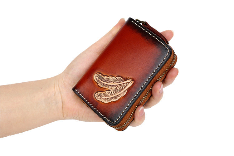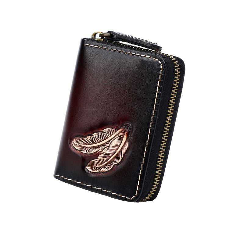 Design: Around Zip Brown Tooled Leather Card Wallet Mens Feather Zipper Card Holder for Men