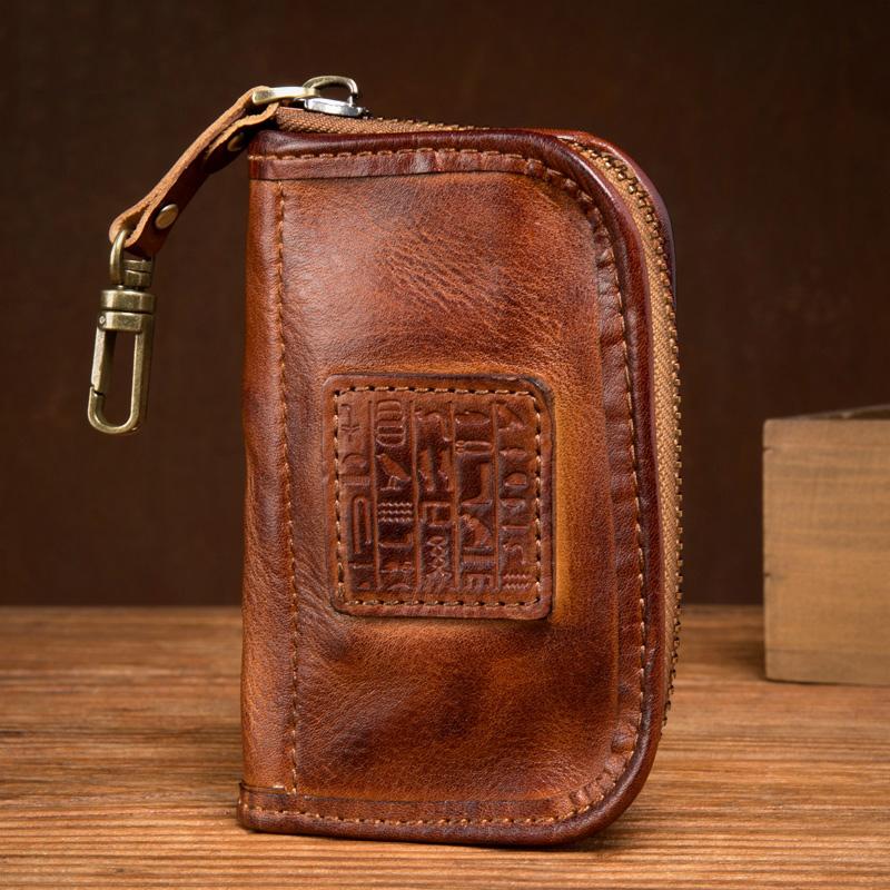 Design: Brown Leather Mens Small Car Key Wallet Dark Brown Key Holder Coin Purse Brown Card Holder For Men
