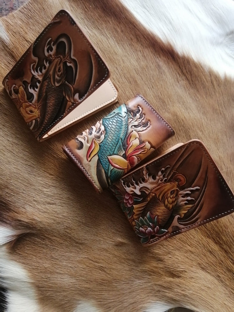 Design: Carp Tooled Leather Wallet Mens Wallet with ID Window Card Wallet with ID Window